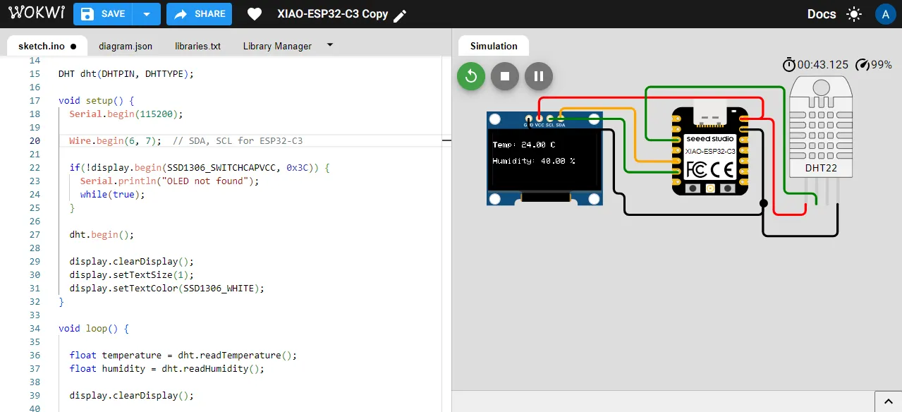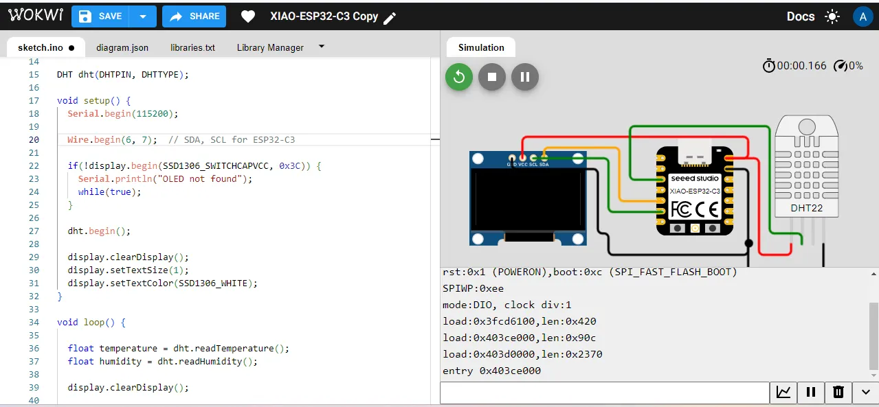 After that, I uploaded the code to the Wokwi simulator and ran the simulation. The output was displayed on the OLED screen, showing the temperature and humidity values read from the DHT22 sensor.