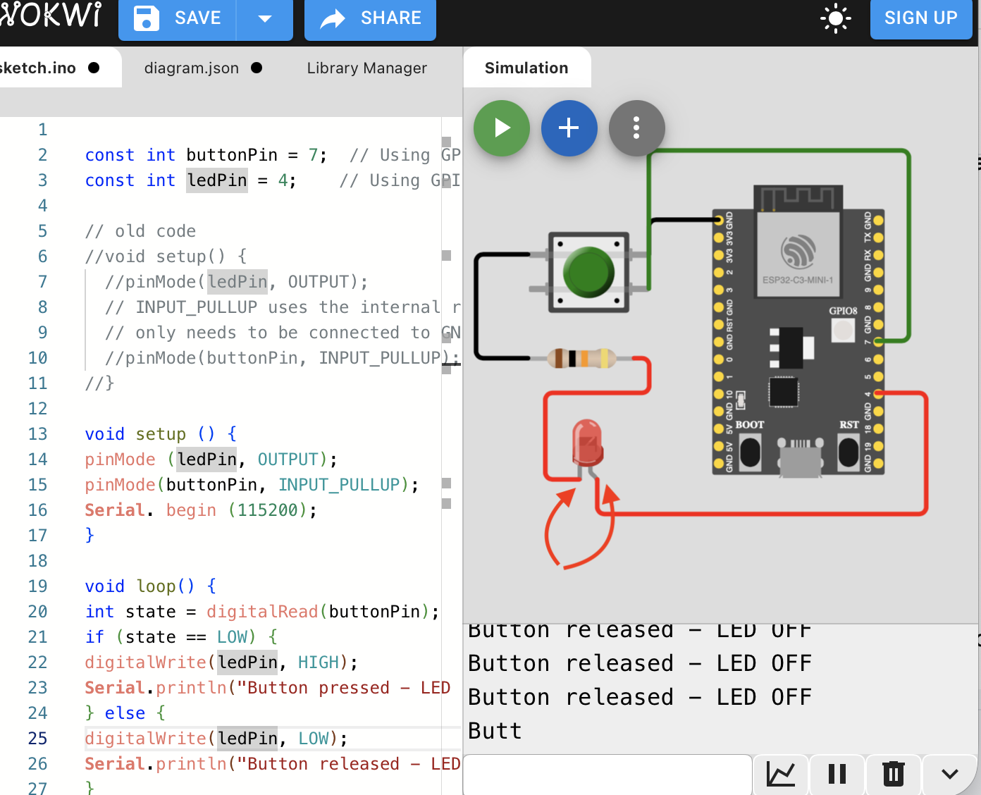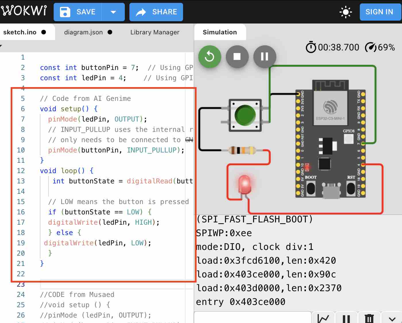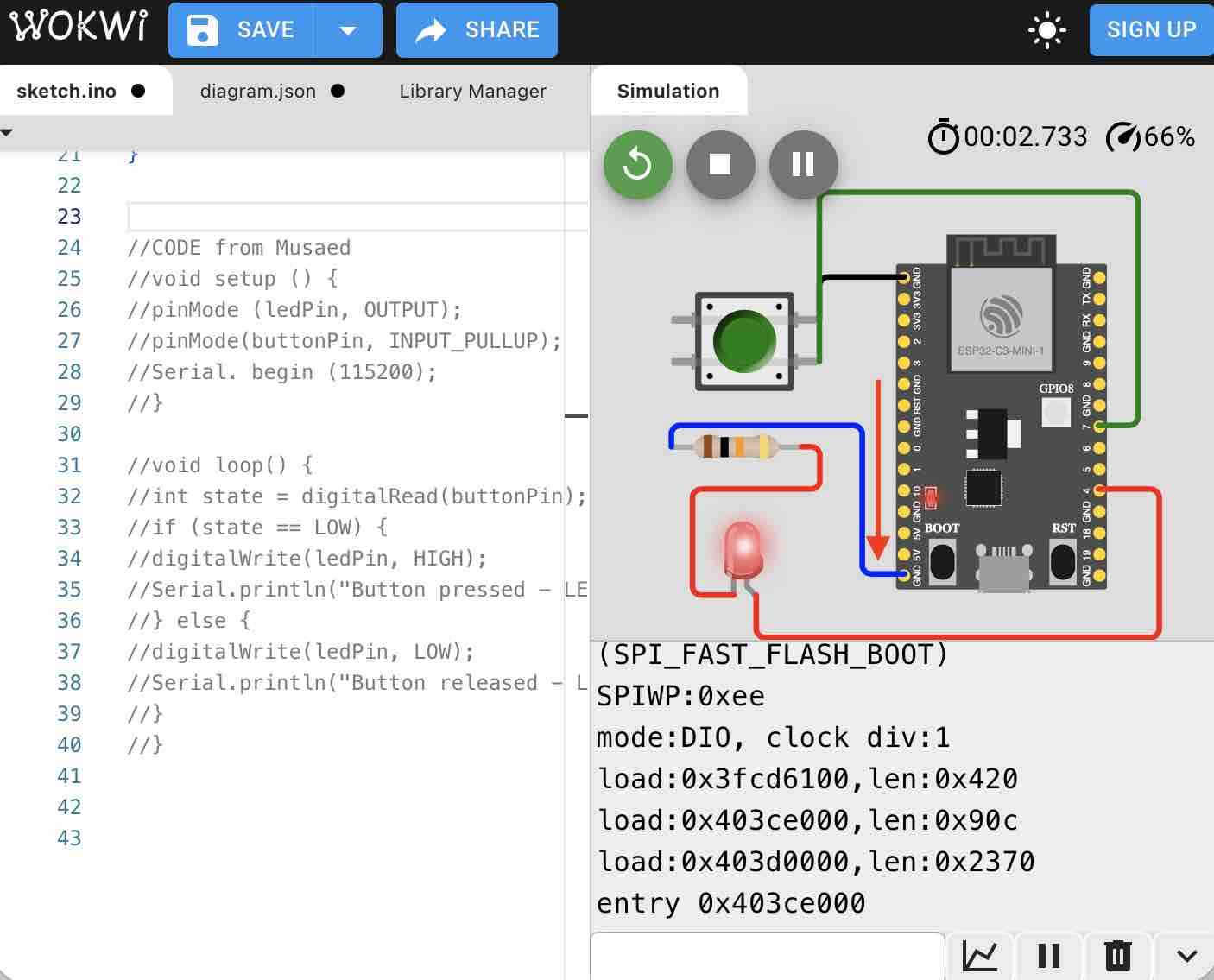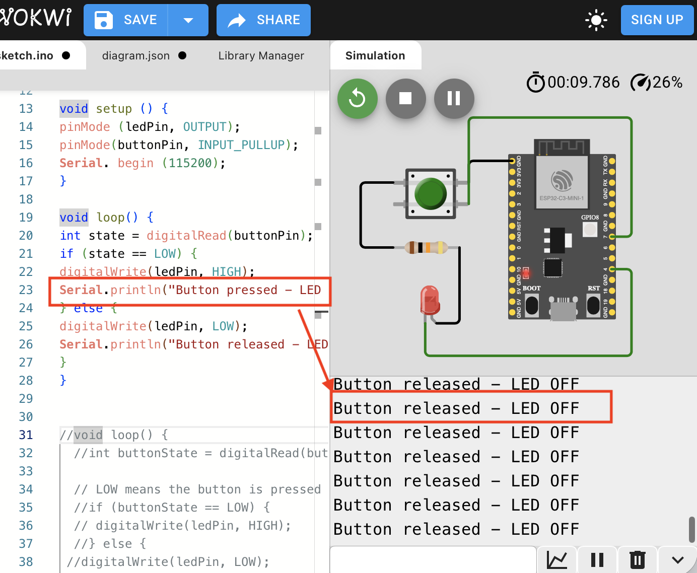 09 | When running the new code, the button was working as the sentence "LED OFF/ LED ON" was printed in the simulation but the LED was not on yet