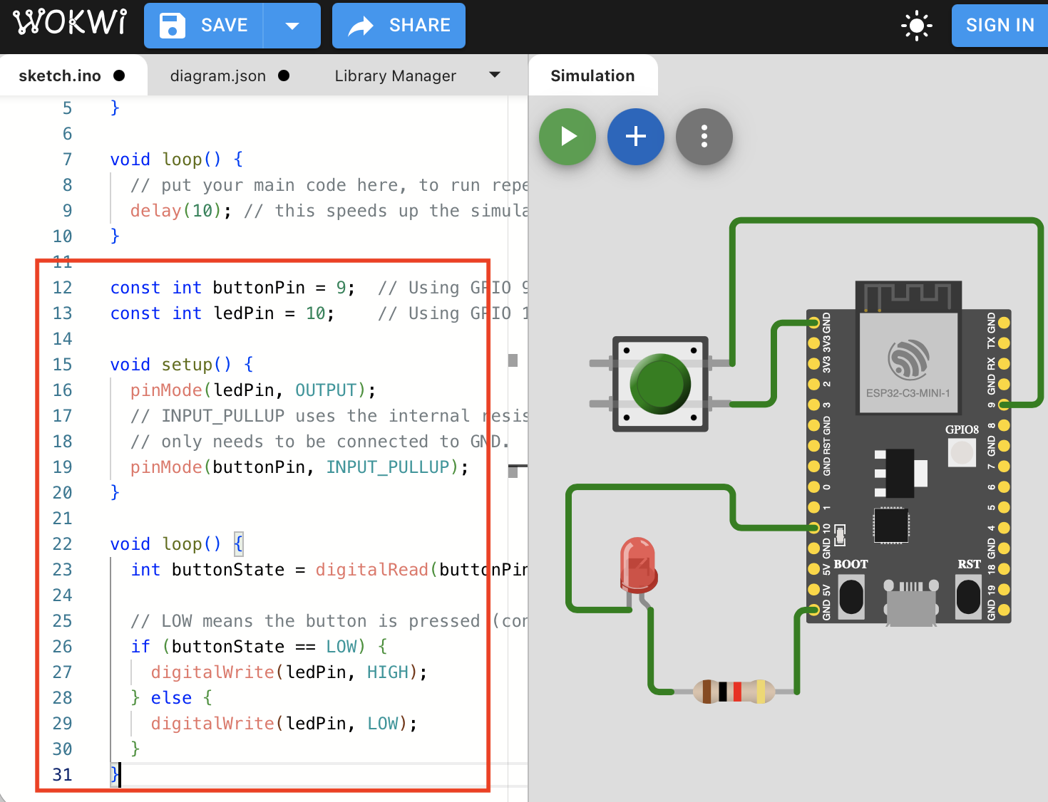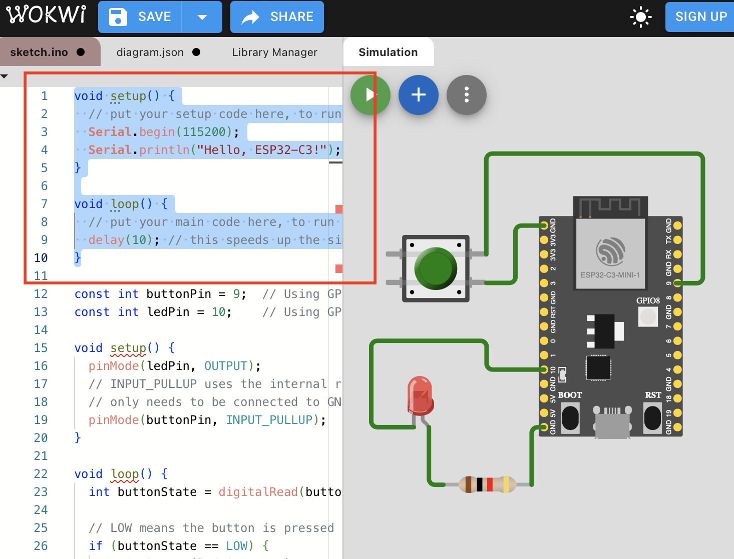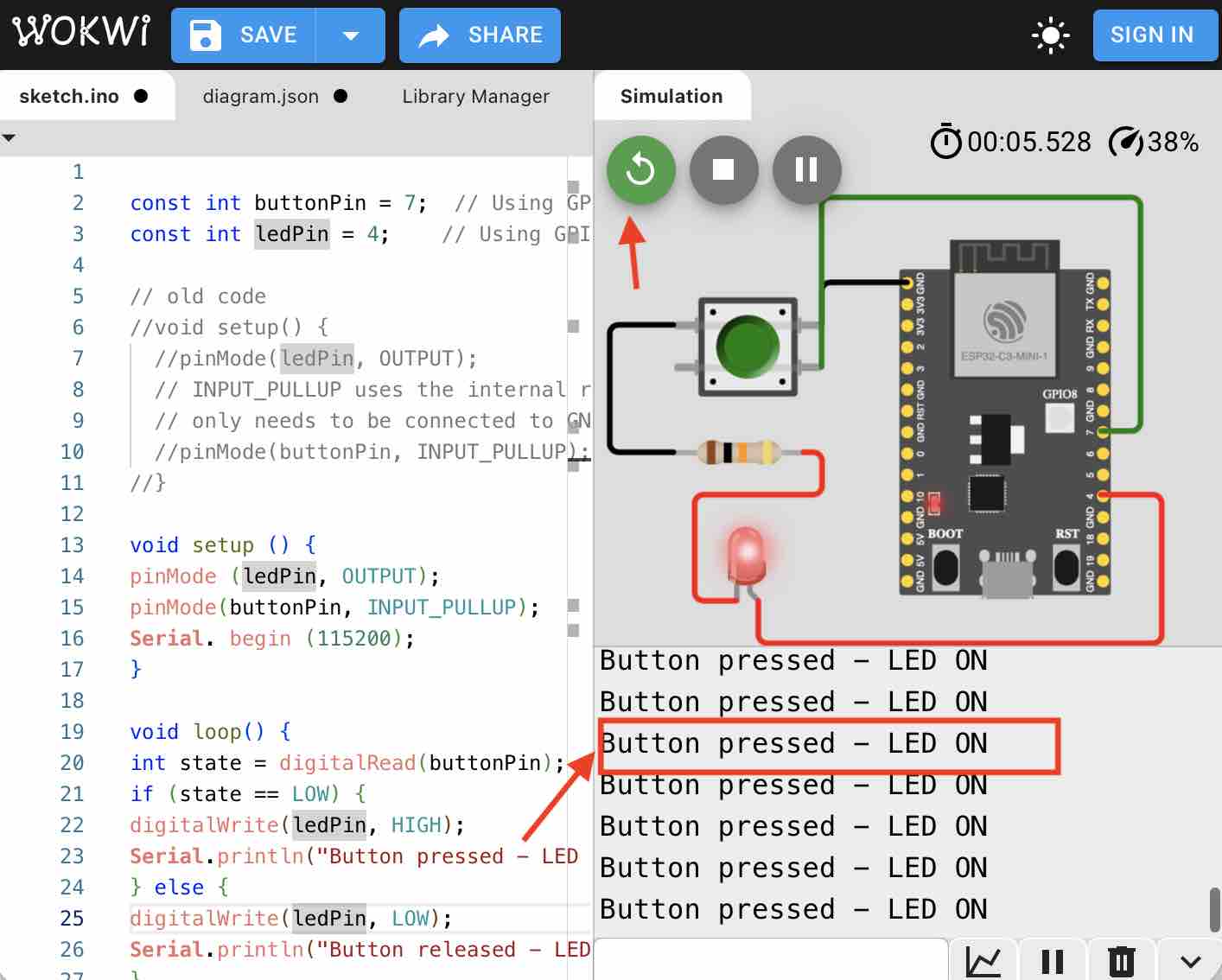 09 | When running the new code, the button was working as the sentence "LED OFF/ LED ON" was printed in the simulation but the LED was not on yet