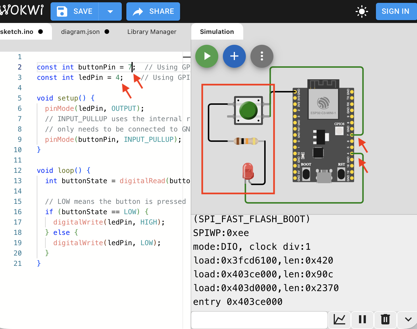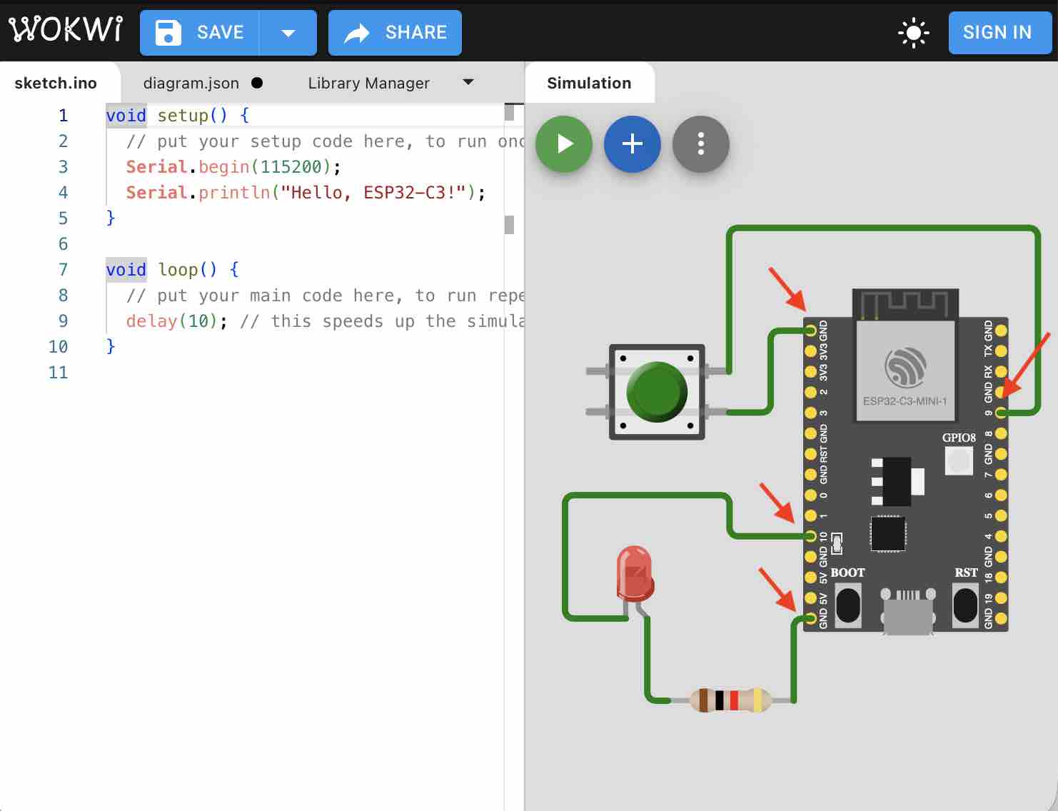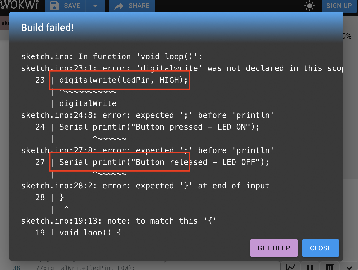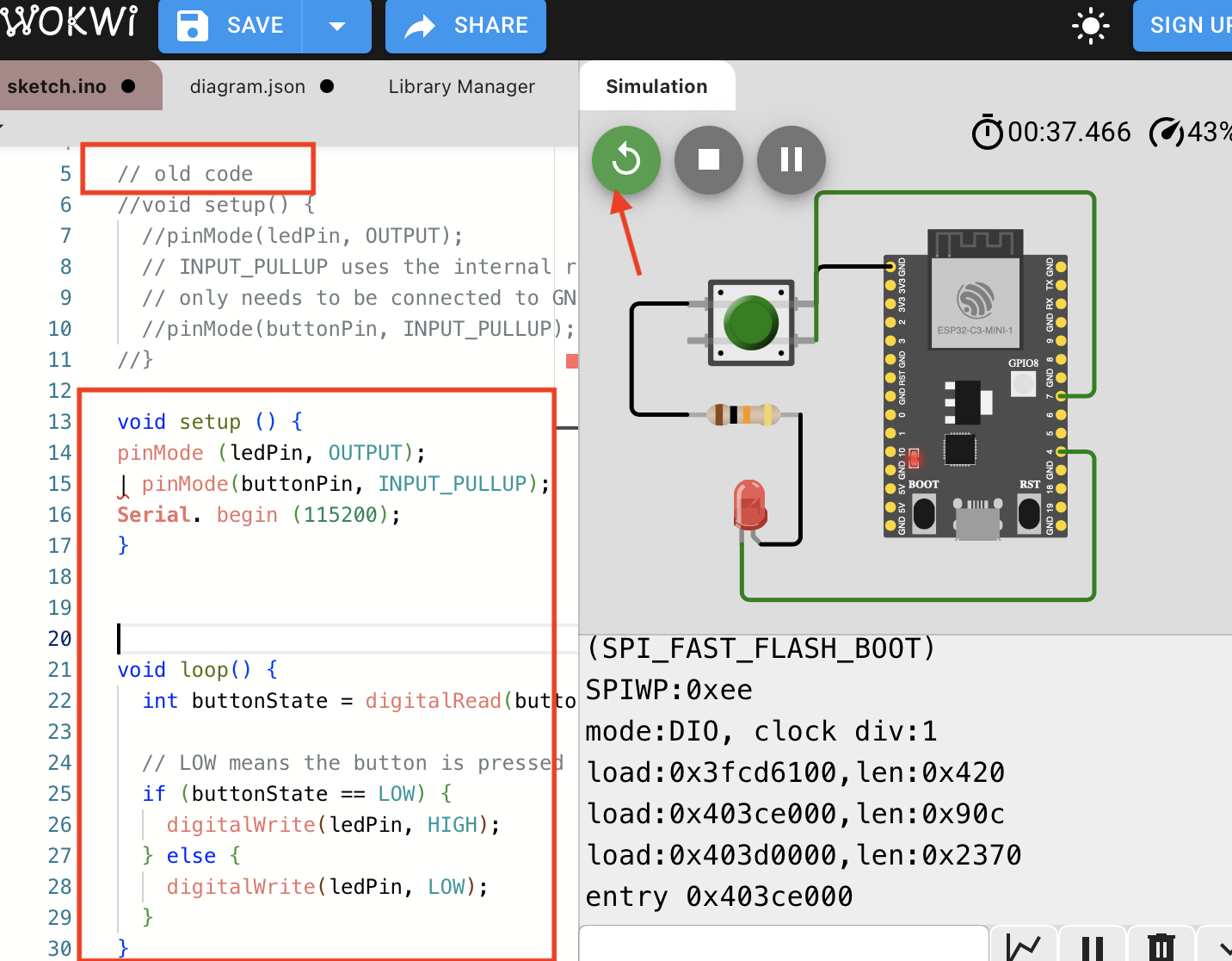 09 | When running the new code, the button was working as the sentence "LED OFF/ LED ON" was printed in the simulation but the LED was not on yet