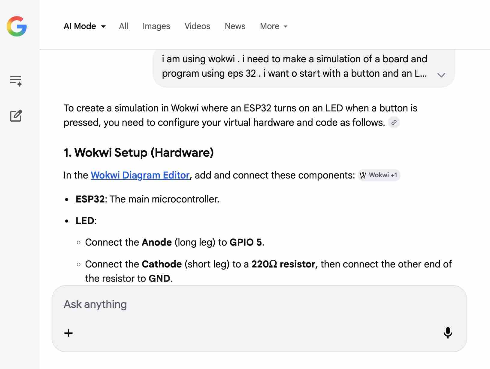 00 | I strated this task by asking Google AI Gemini to provide me with steps to use Wokwie to design and simulate a simple curcit