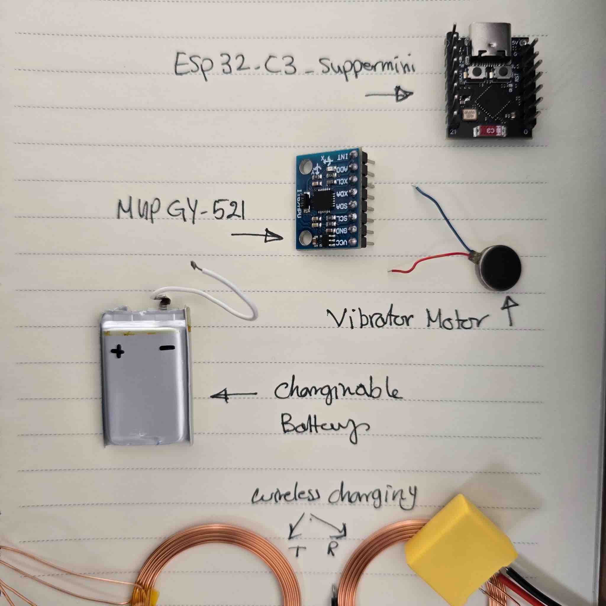 04| The main parts for each clip ESP32-C3-SupperMini MicroController → MUD-GY-512 → Vibration Motor and those will be programing using C++ or MicroPython