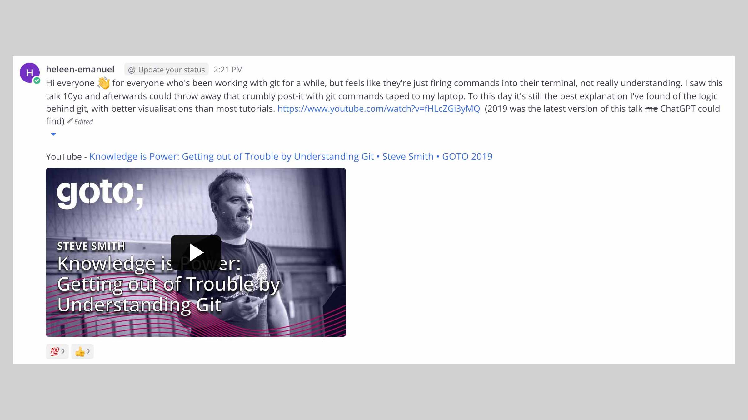 I remember that one talk that changed it al, at Codemotion Amsterdam 2016 Steve Smith from Atlassian gave the talk on Git. So I decided to rewatch the latest recording of it and share it with my classmates.