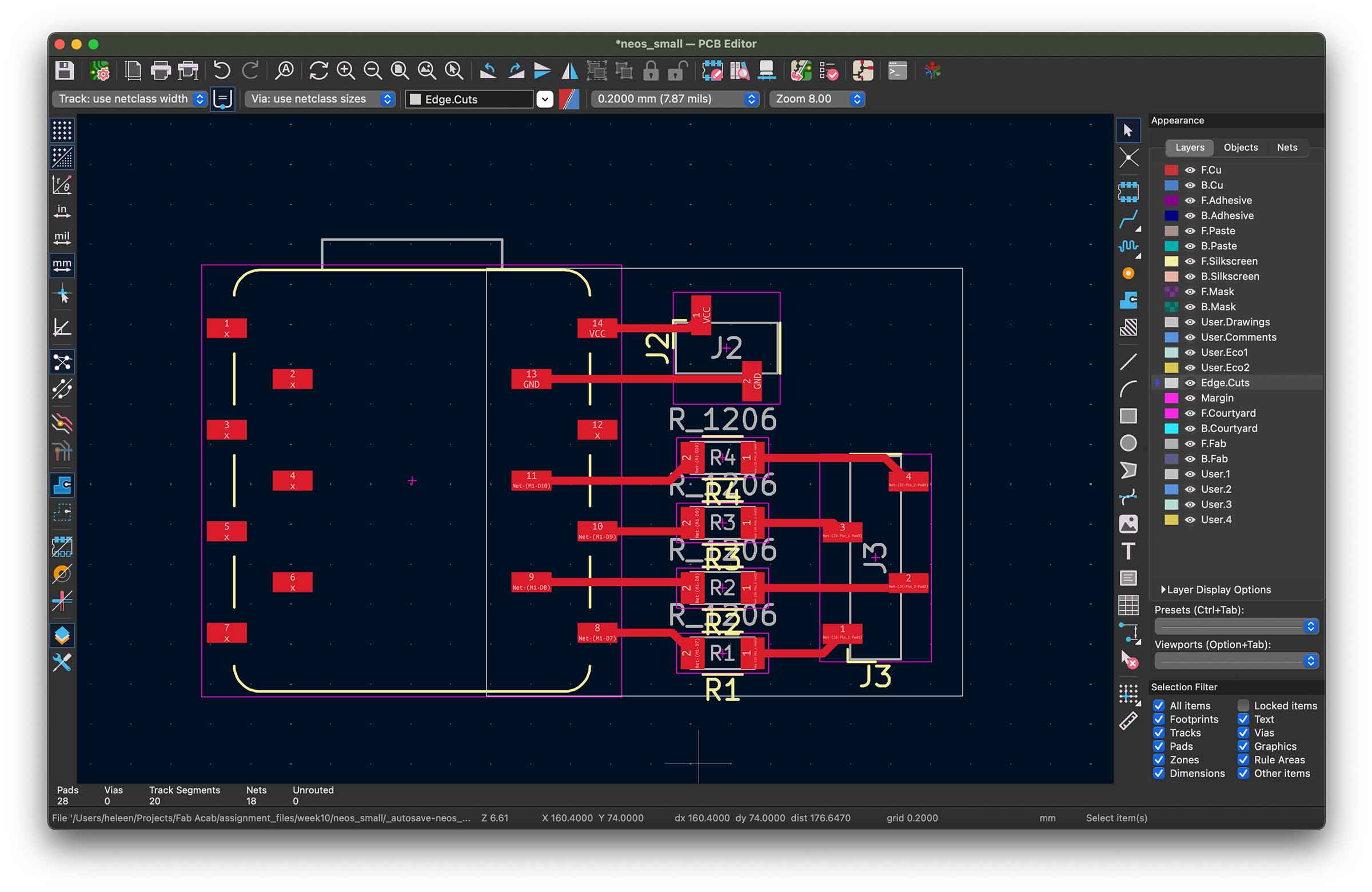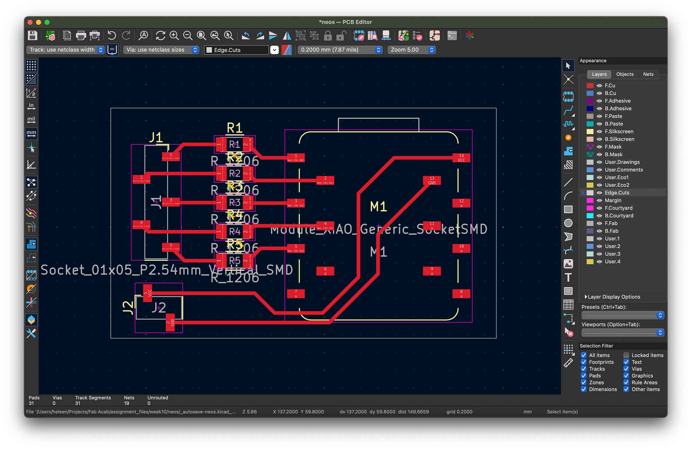 While designing my board I've used 5 pins for data because that's the minimum amount I would like to use for my final project. But while laying traces in KiCad I realize that with 4 pins I can make an even smaller footprint by not connecting one side of the Xiao. So as I'm waiting on the milling to finish I quickly whip up a design in KiCad. Could be a funny thing to try in a future week.