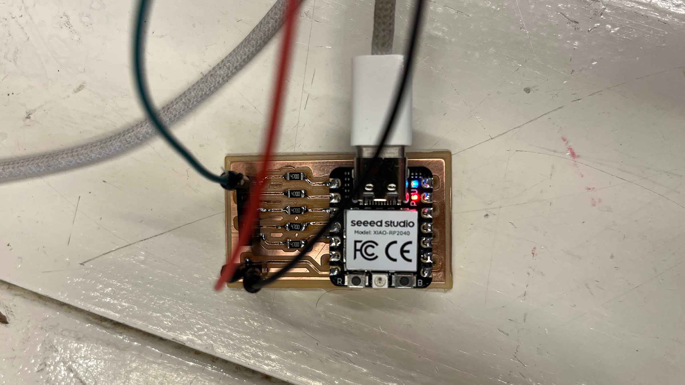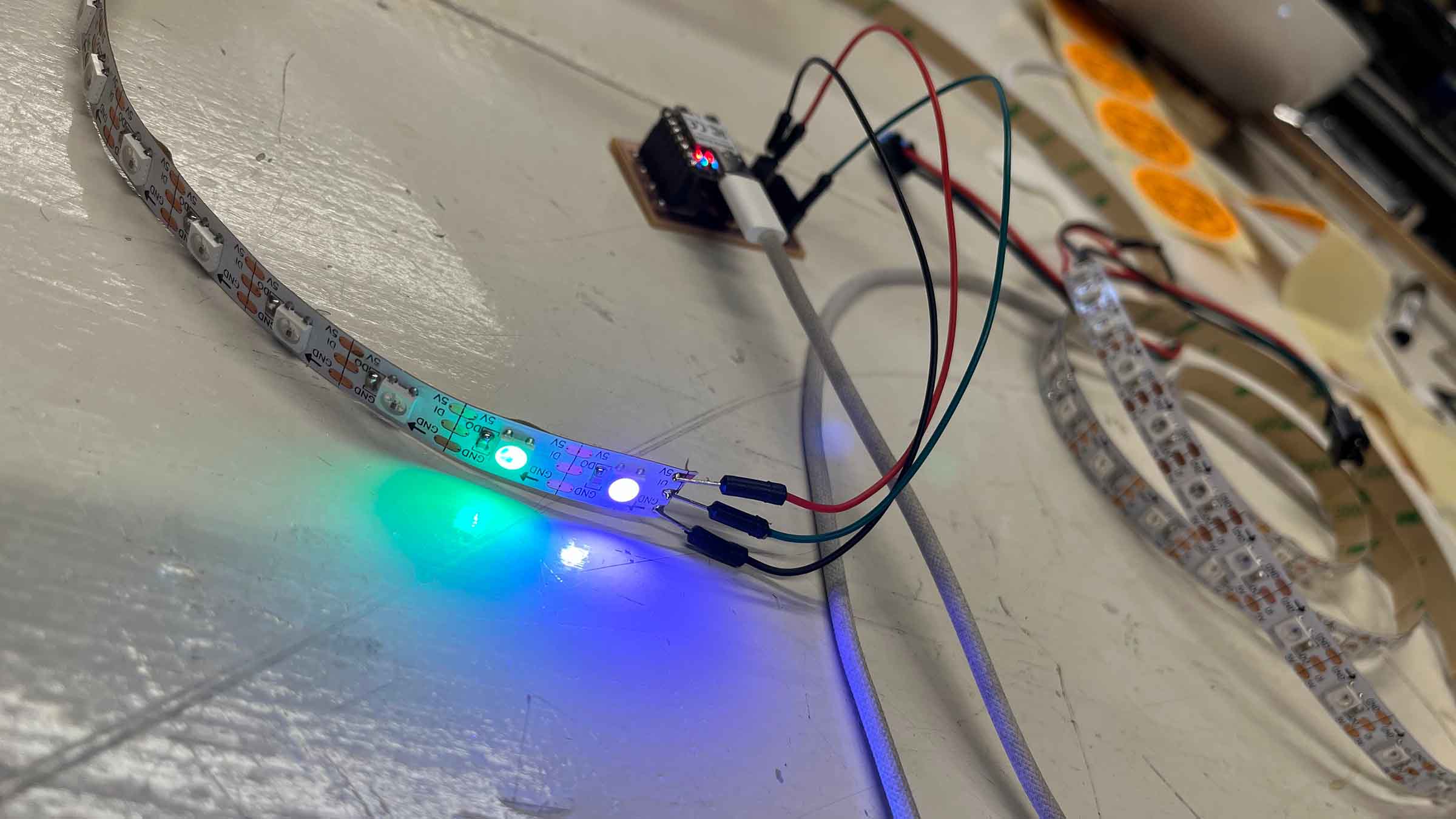 After we finished the group assignment I took home a strip of WS2812 Neopixels, which I then tried to hook up to both my Arduino and my RP2024 with a breadboard. In both cases I could not get them to turn on, they would briefly flash when I hooked them up to power. After a confused debugging session with code by ChatGPT, Fab instructor Quentin Bolsee and Adafruit I tried the same code on the Neopixel embedded on the RP2040 which ran just fine. Turns out I took home a bit of strip that cables connected only to the end of the strip, so I was pushing data into the data out line.