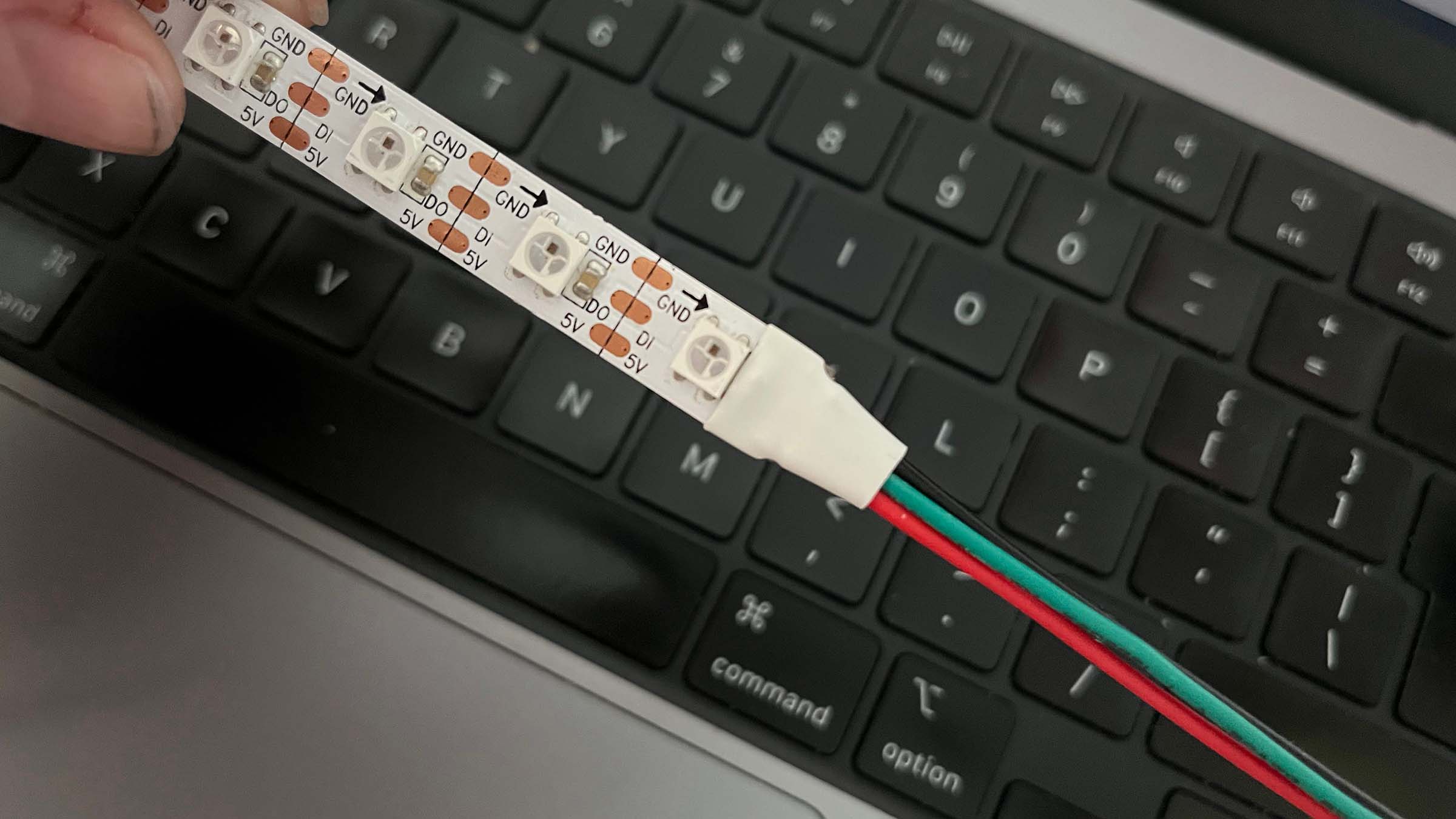 After a quick trip to the hardware store I am now the proud owner of a soldering iron. I sacrificed three jumper cables from my Arduino kit and finally got the strip to run smoothly when it was already dark out; they lit up the whole room, which was very satisfying.