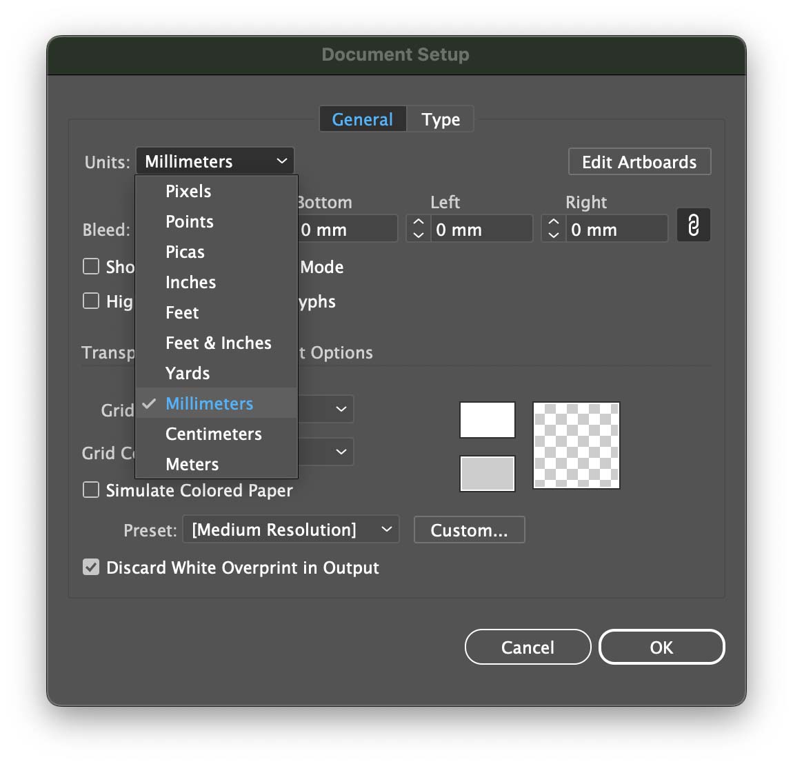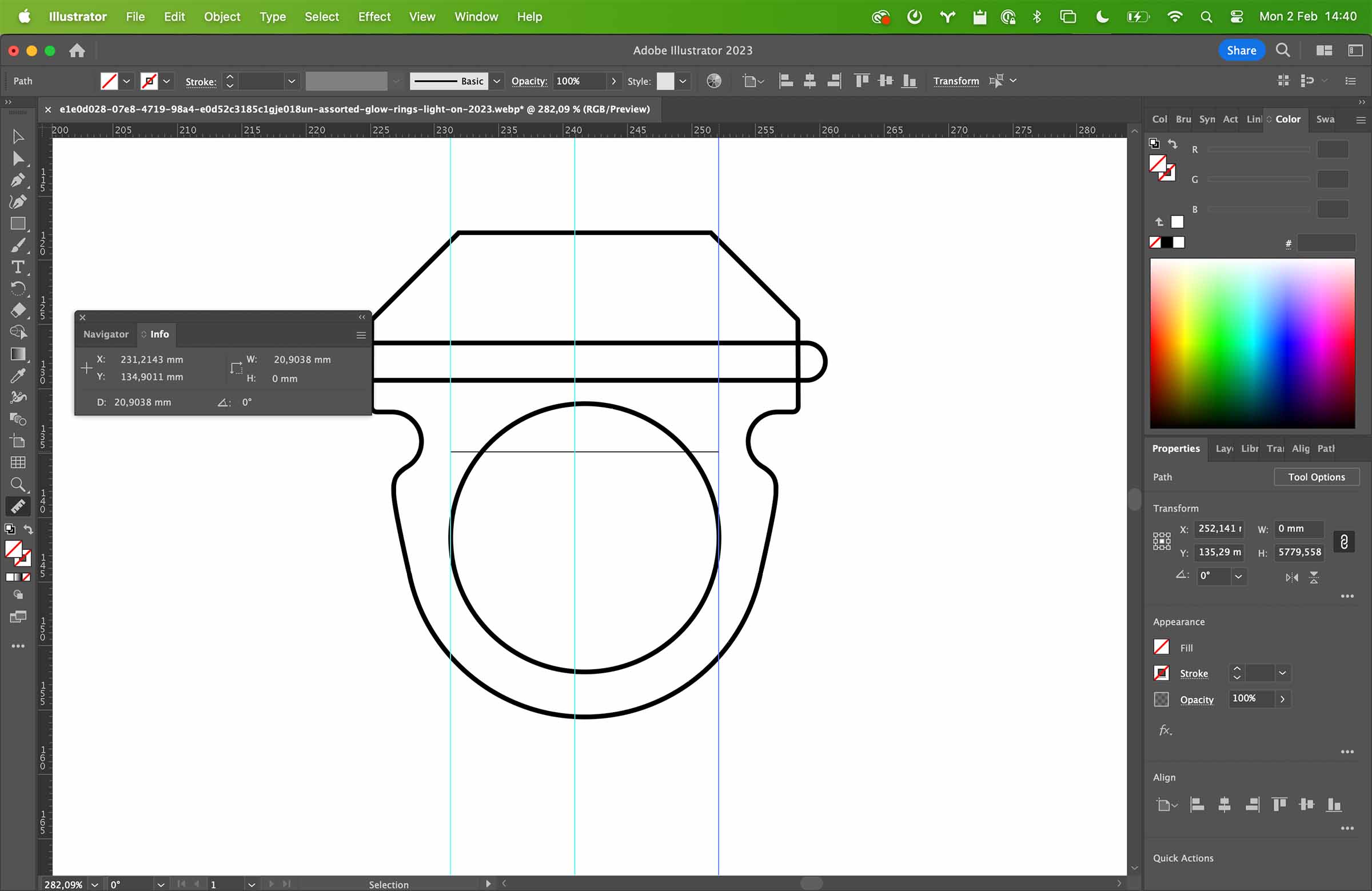To make a more precise 2D model of this ring I decide to trace it in Illustrator and export the SVG into Inkscape. This gives me a change to compare the format and see what happens when importing them into 3D software. Since this ring is teeny tiny I first need to set Illustrator to use millimeters instead of pixels as a unit.