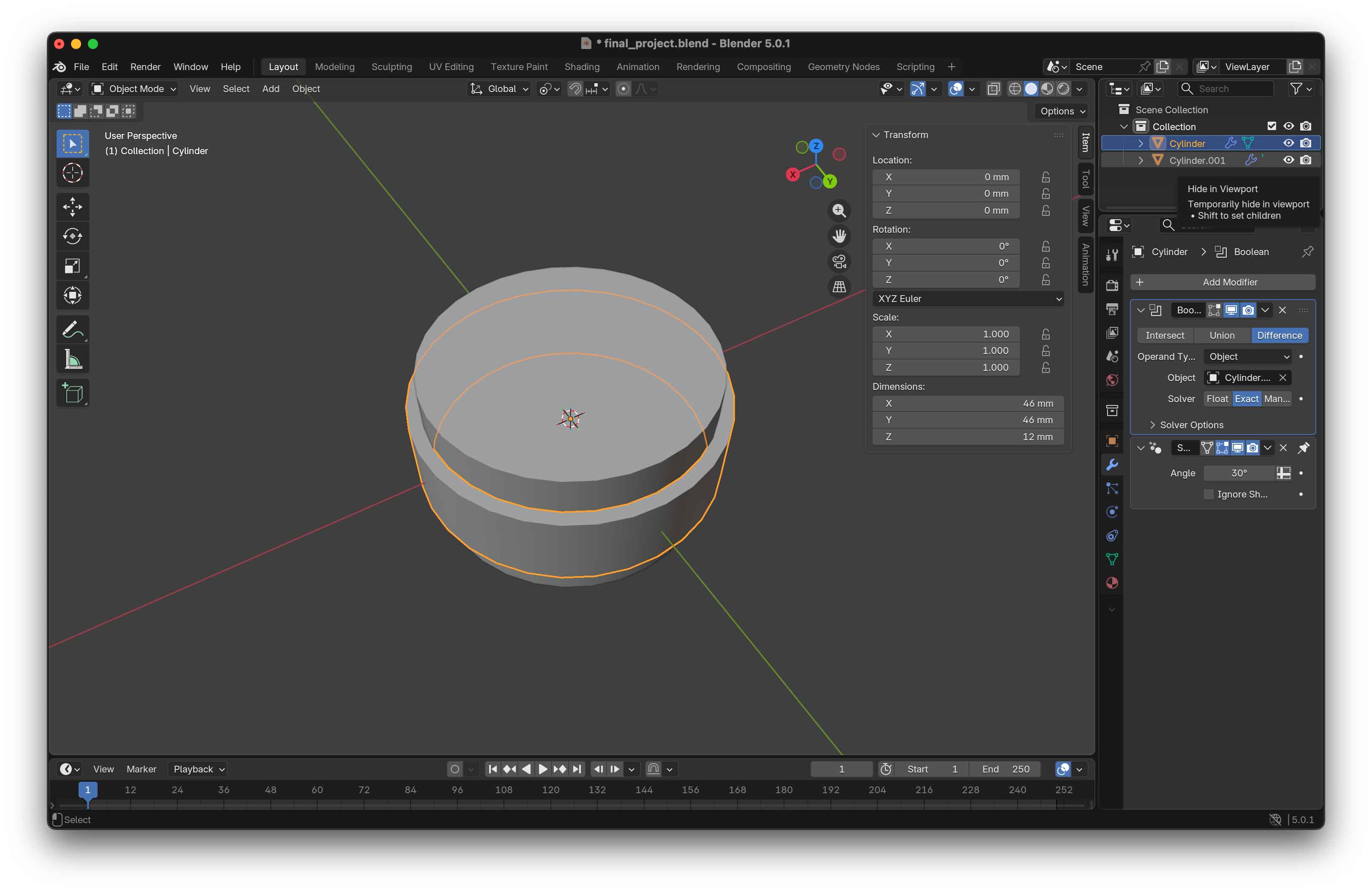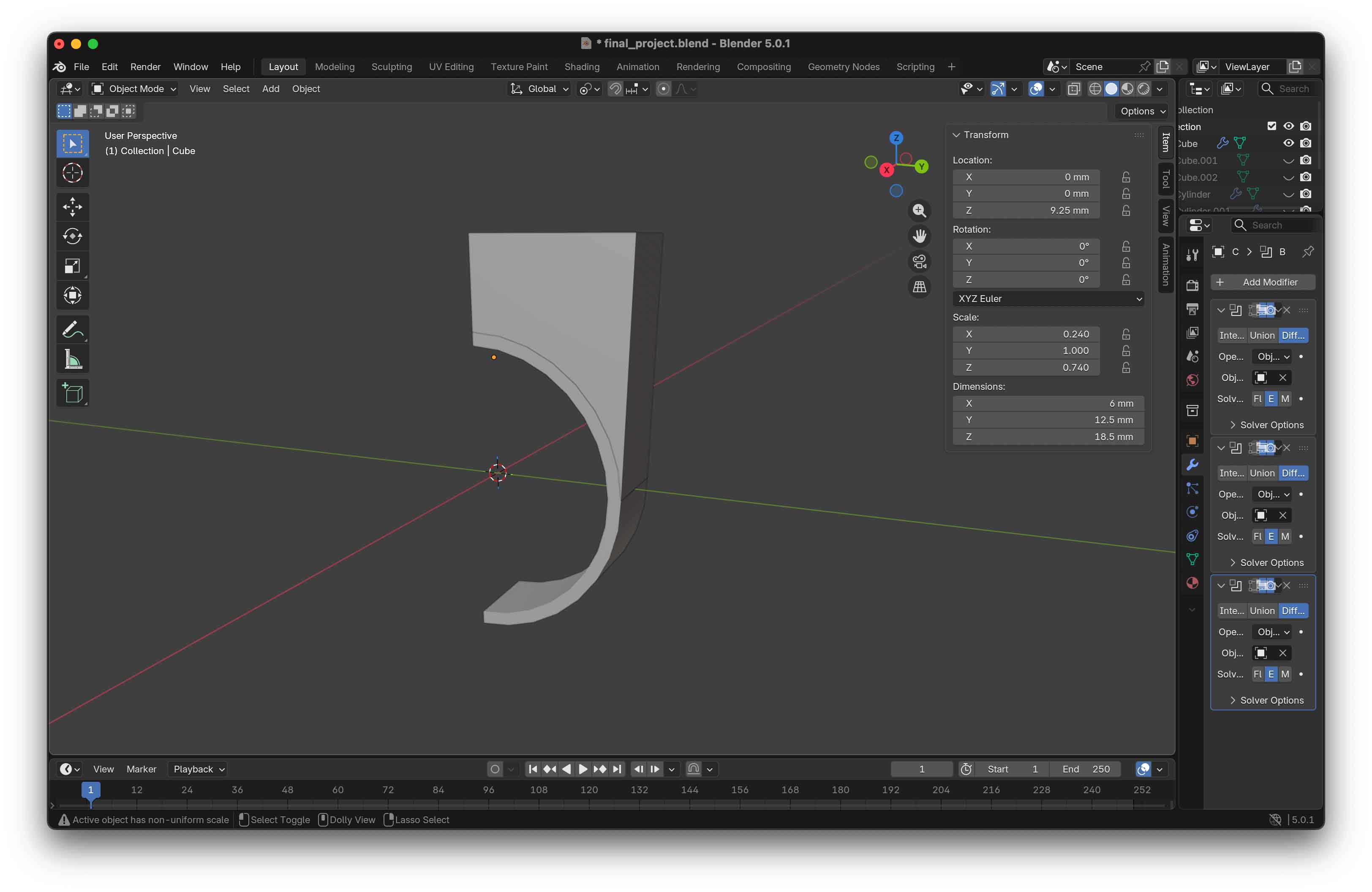 Not looking badly, next up: boolean operators, time for another tutorial. Like always with boolean operator it takes a bit of fiddling with the settings, but I find the right combination. Ok, maybe not looking great either, what's that weird sliver doing there?!