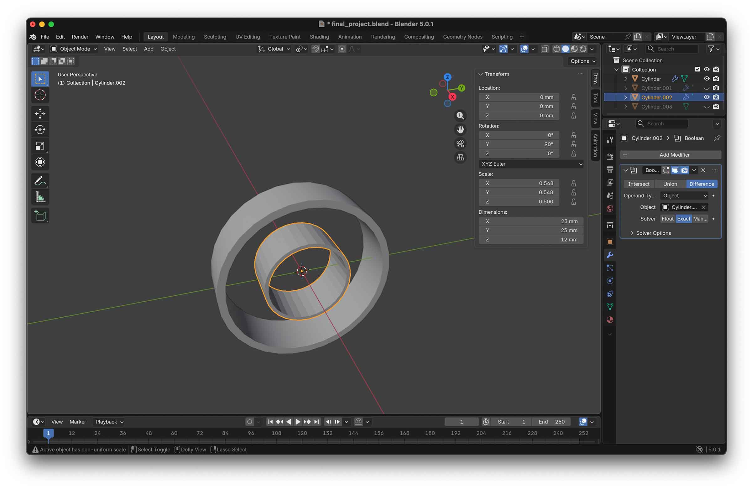 This time I decided to start from scratch instead of starting with a sketch. I built the ring first by putting a 21mm cylinder into a 23mm cylinder and using a boolean modifier to create a hole.