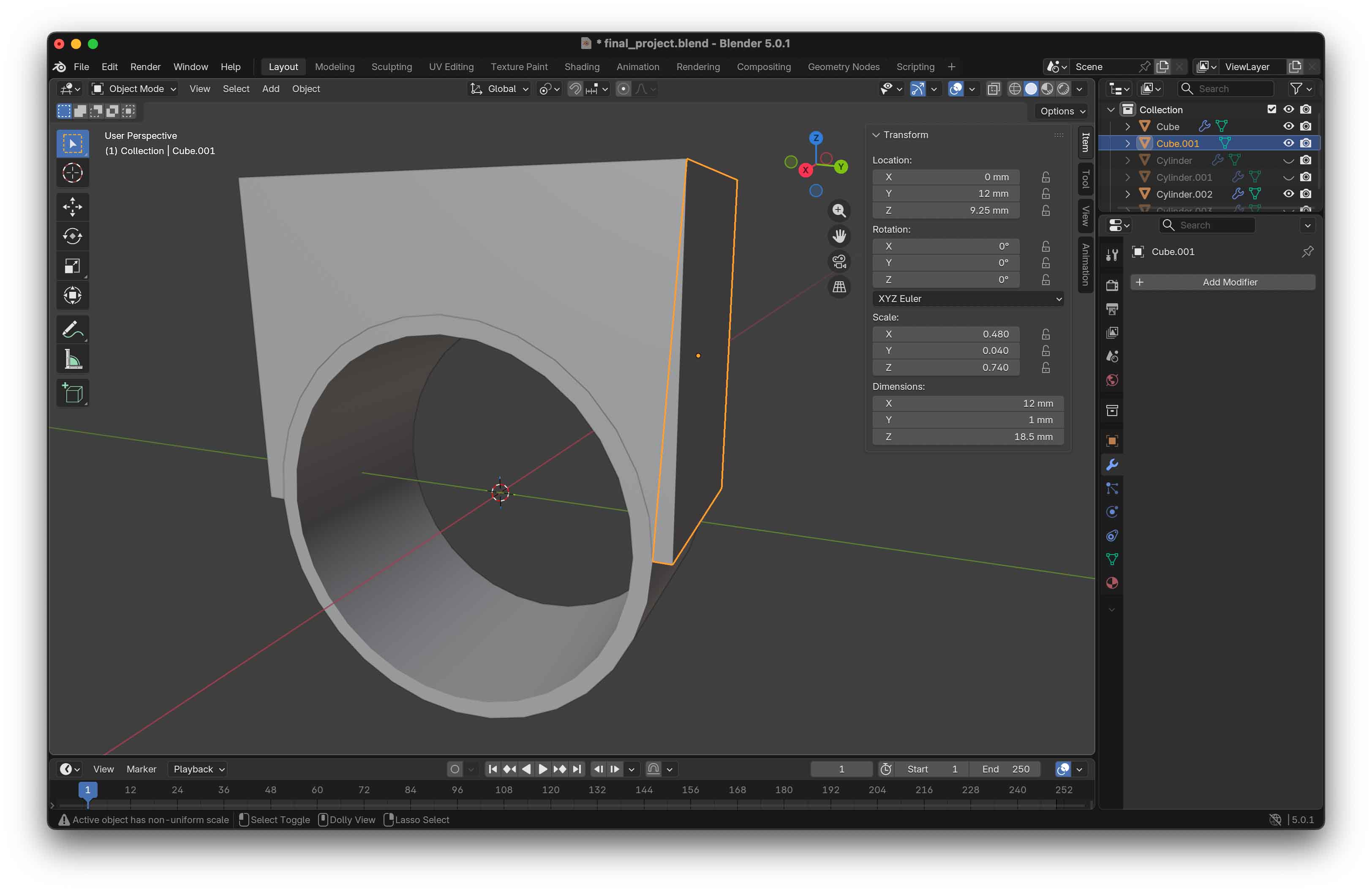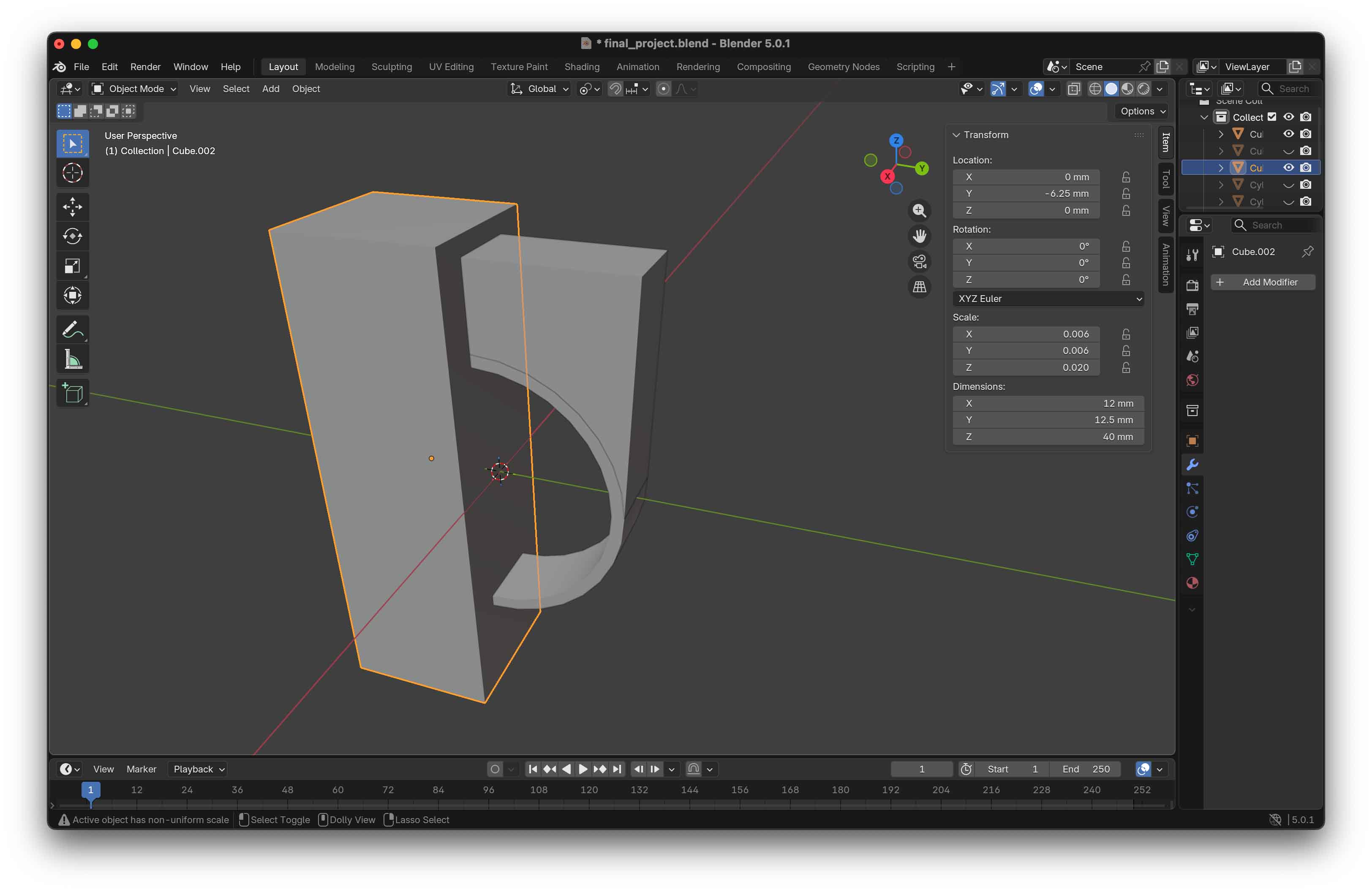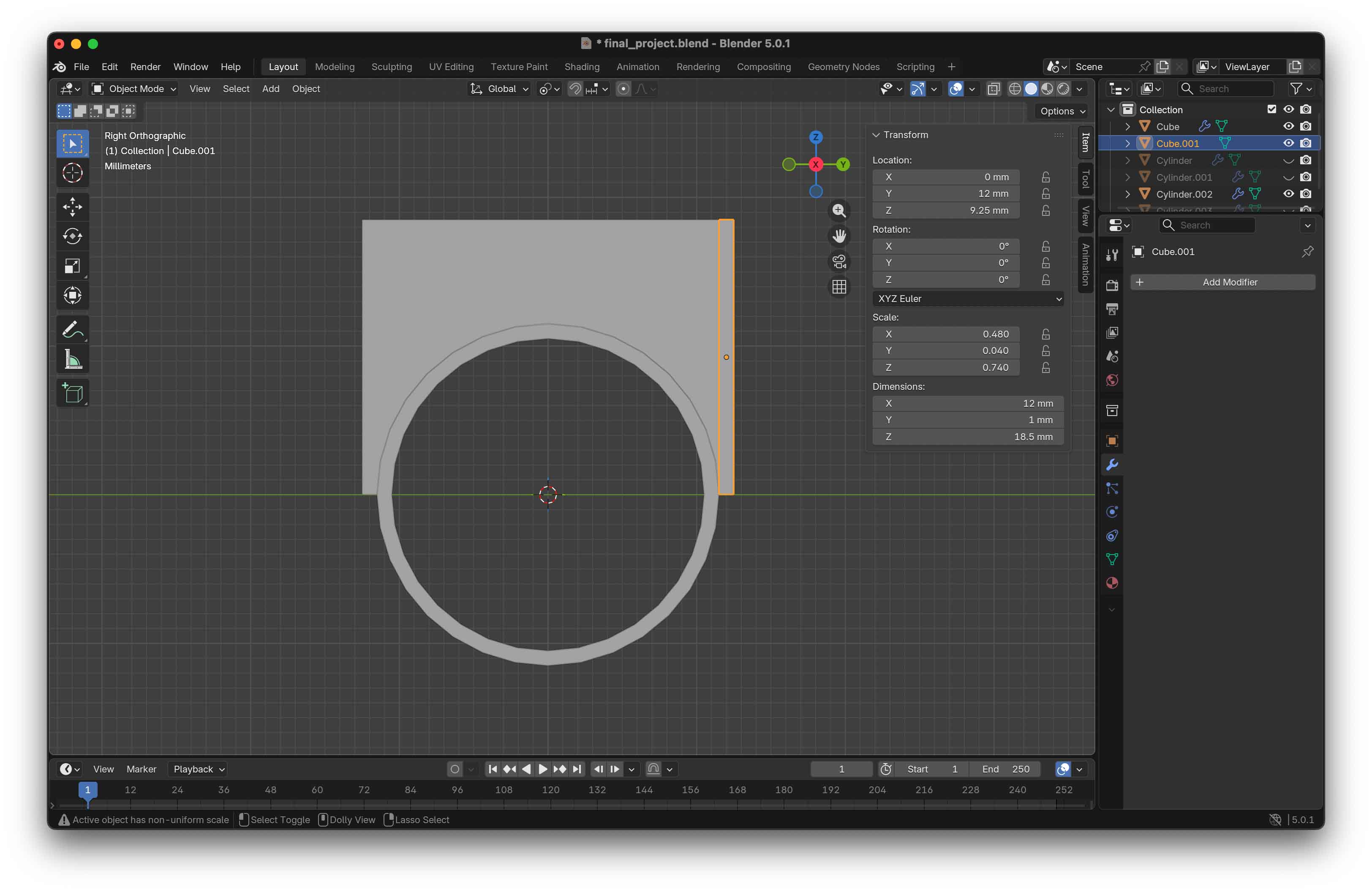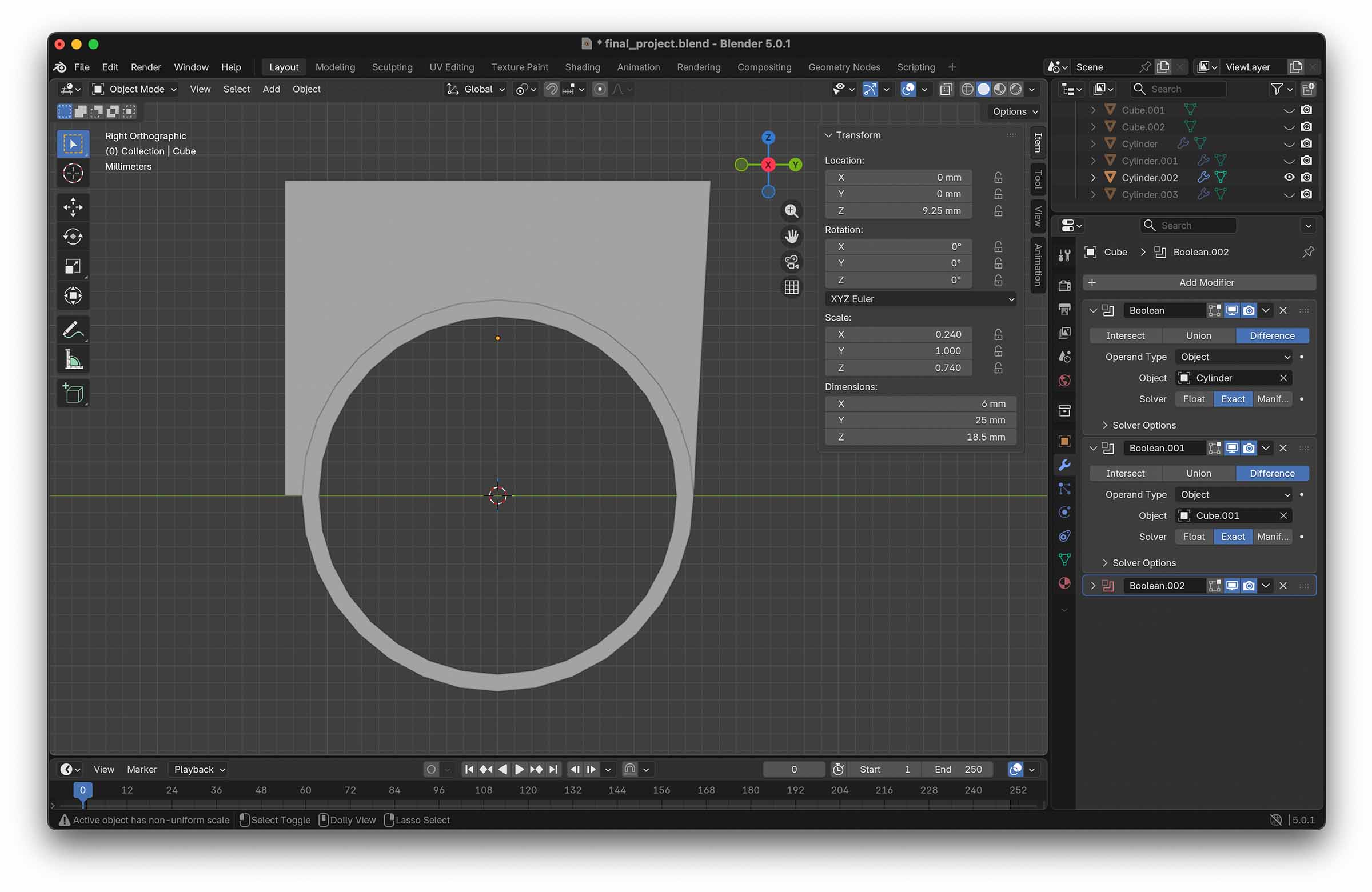 My plan this time is to only model a quarter of the ring and then duplicate it to make the other 3 parts, so I'm changing the depth (z-value) of the ring and box to half (6mm). And I add a cube to slice the model in half.