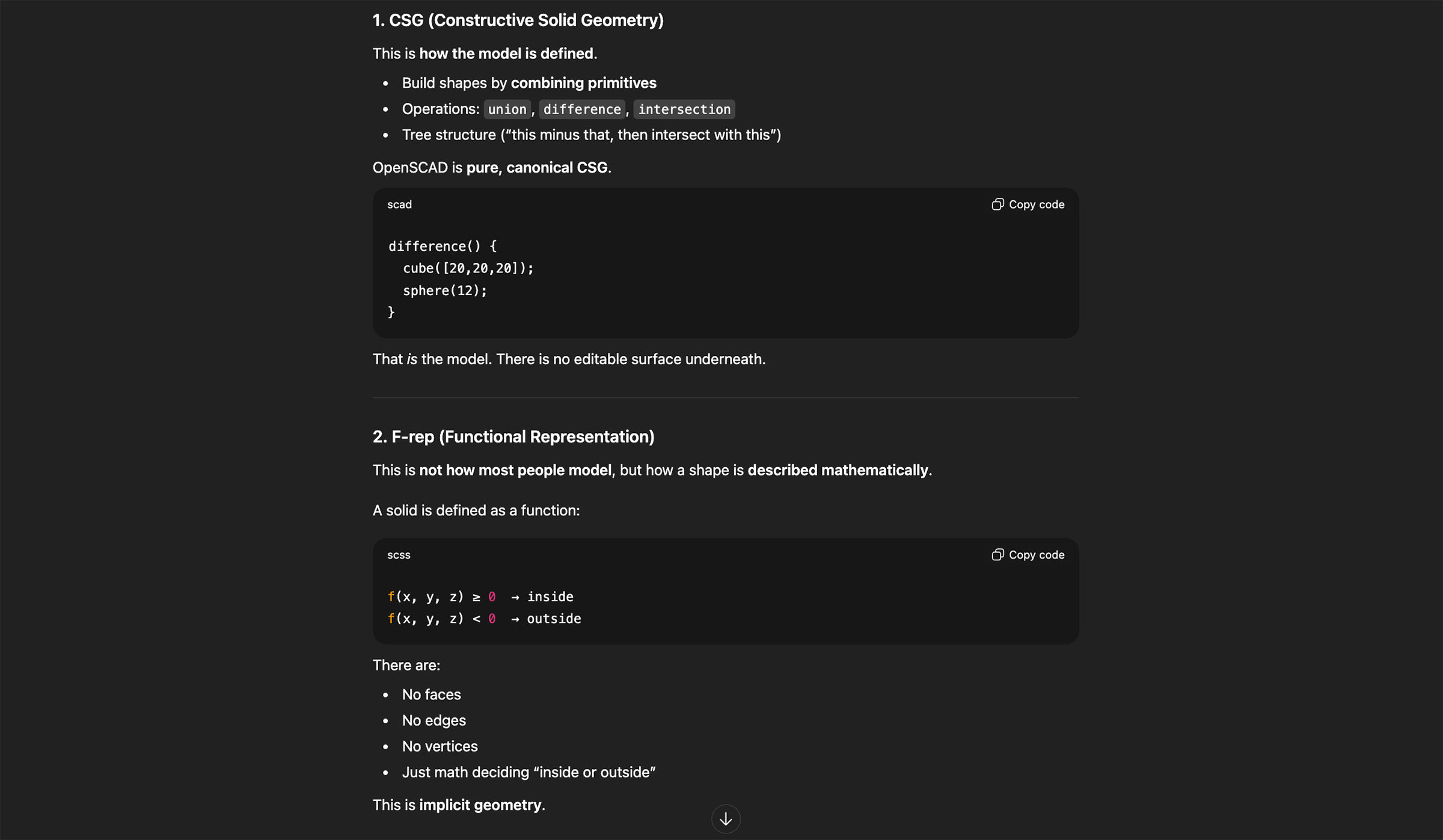 I notice none of the tools in the sheet mention 'f-rep' as a geometry representation and wonder what the difference is between CSG and f-rep; so I ask my buddy ChatGPT.