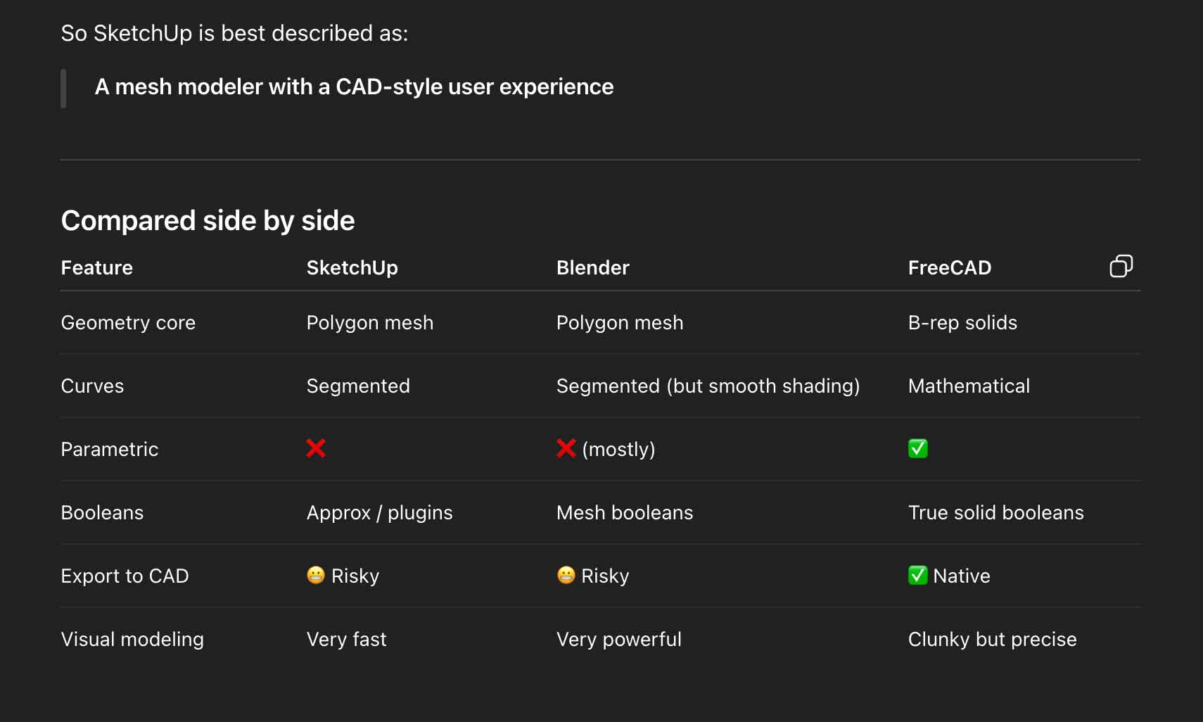Looks good! Looking at my sheet I notice that SketchUp's geometry representation is described as 'Polygonal surface modeler' which means very little to me. As I have experience with SketchUp for interior design, I ask ChatGPT what's up.