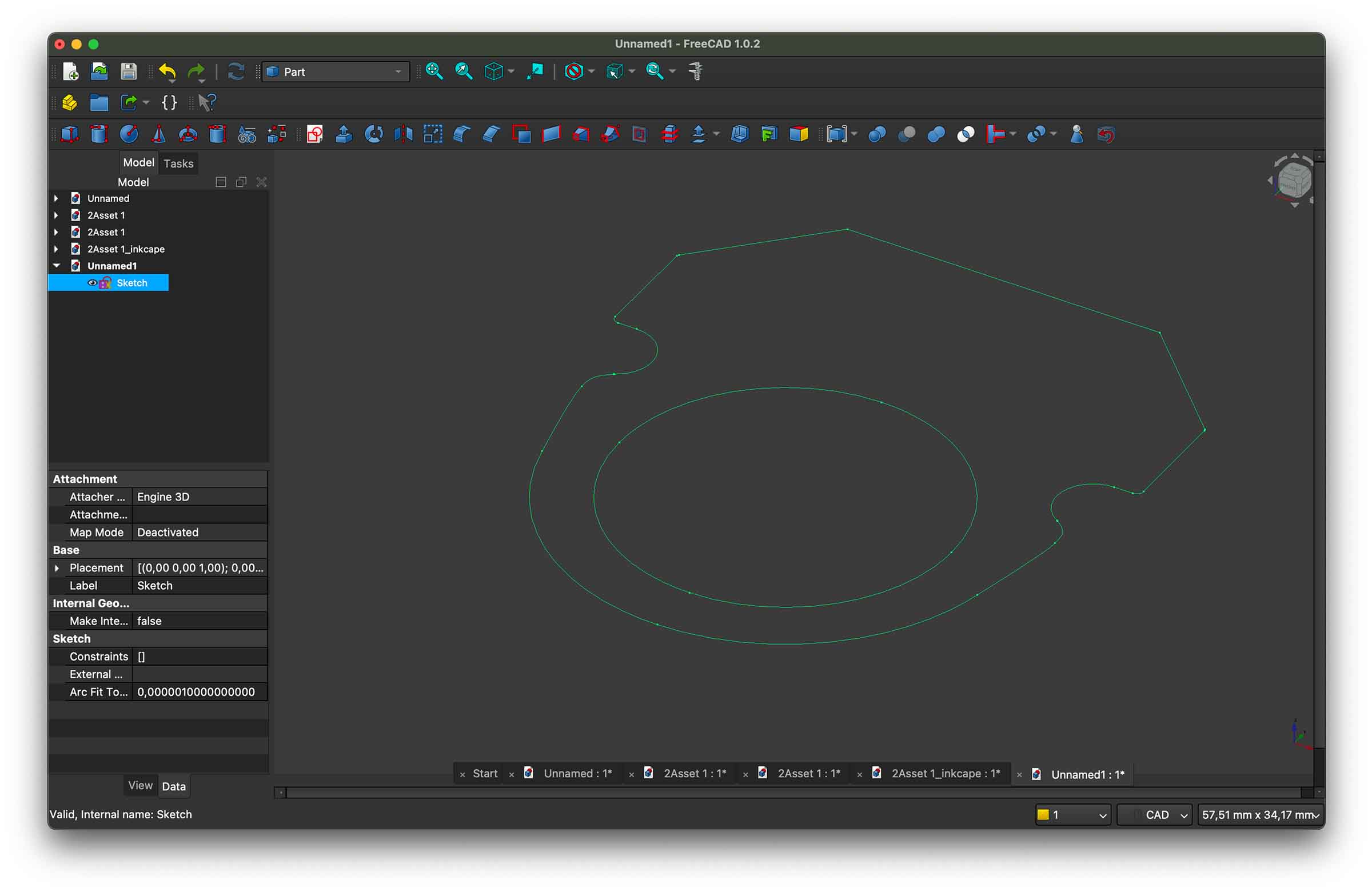 So loading and SVG into Freecad is easy, but this gives me separate paths I have no clue what to do with. To extrude the base shape I'll need a sketch, but how?! I watch this Youtube tutorial and following the tutorial instructions I select the paths that make up the base of the ring and use the 'draft to sketch' functionality.