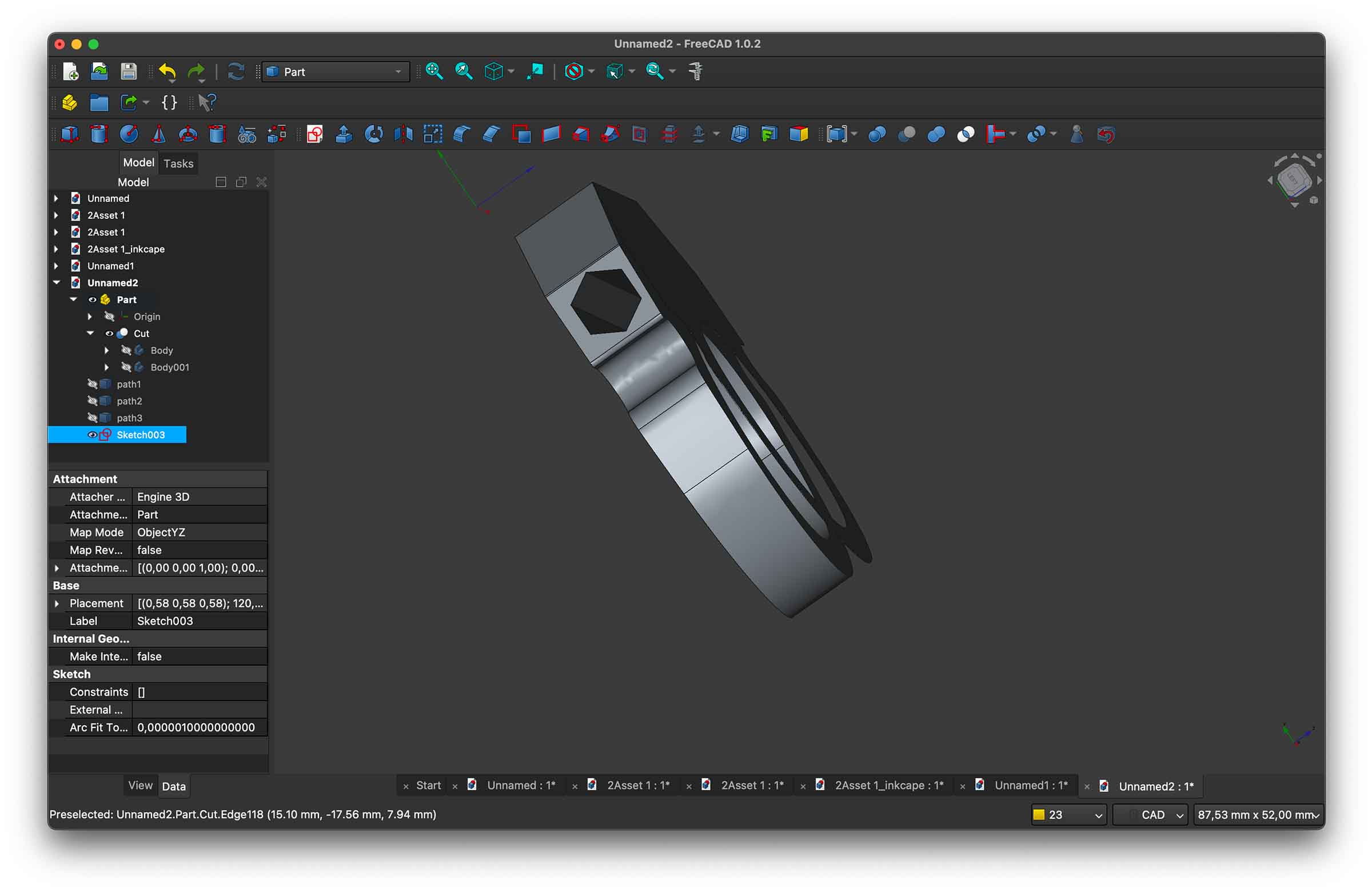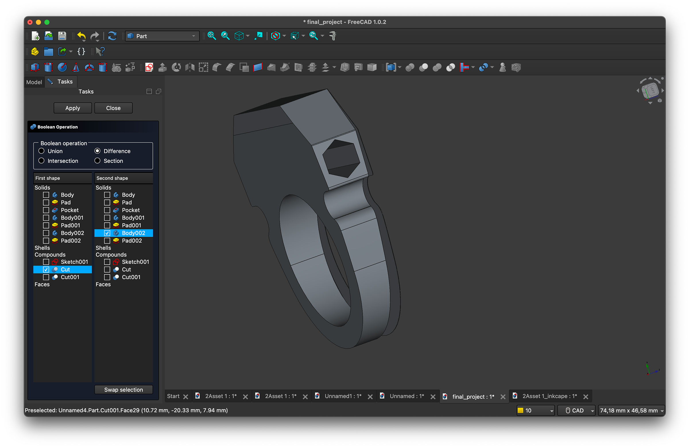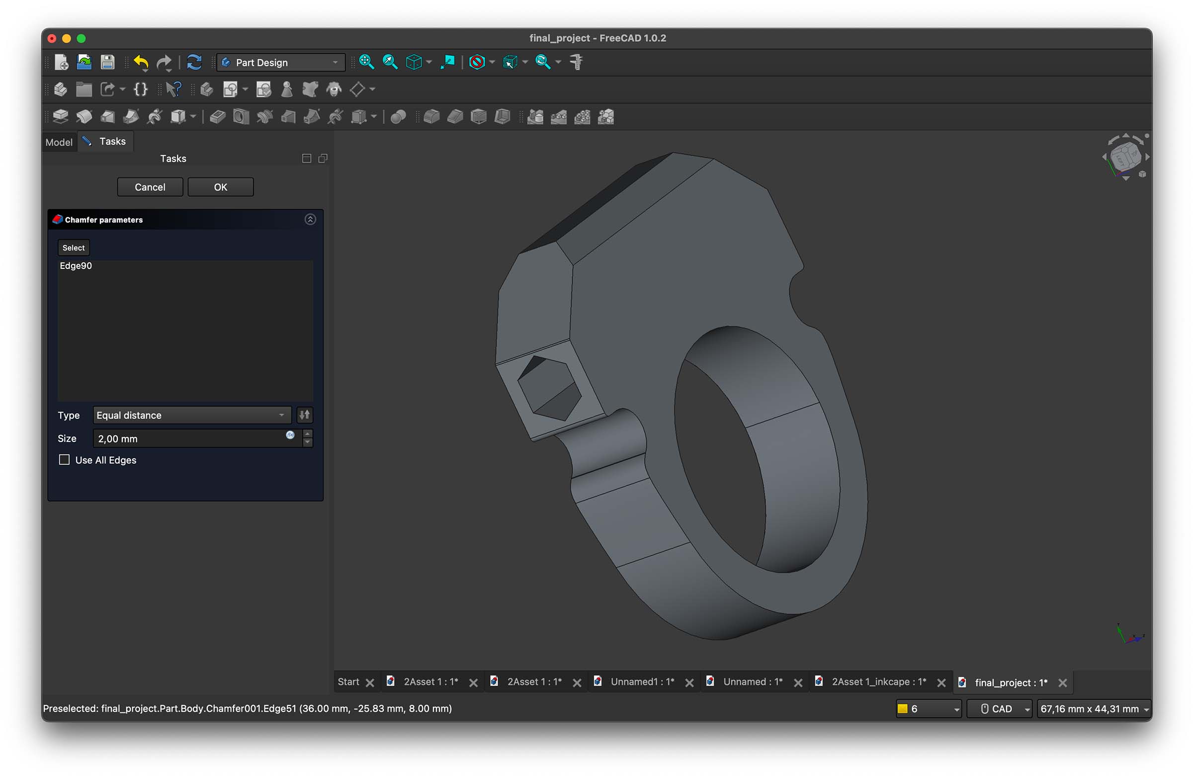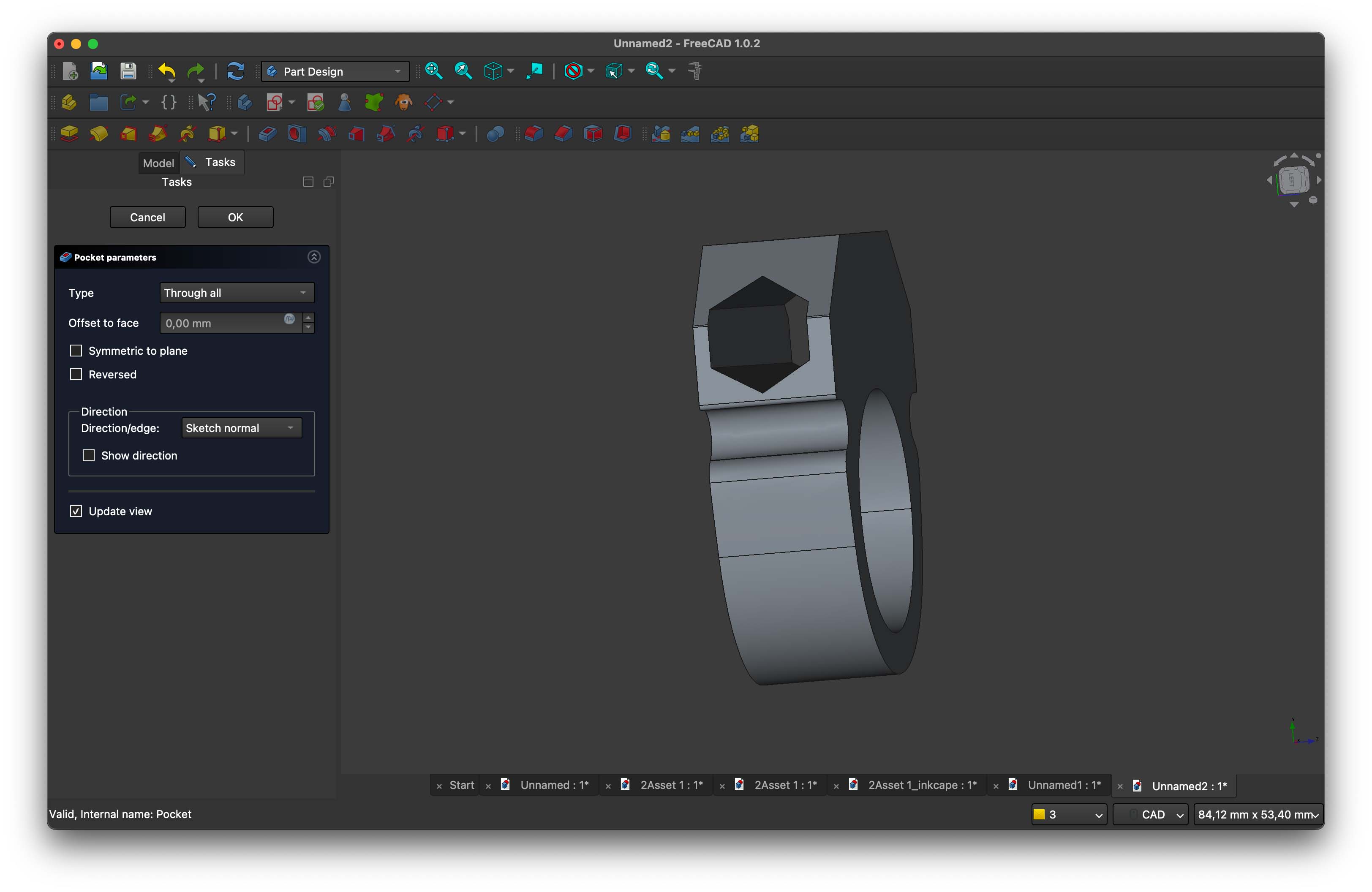 Next I go into 'Part design' mode, click the 'pocket' functionality and set 'Type' to 'Through all', now I have a beautiful hexagon shaped pocket in my ring base.