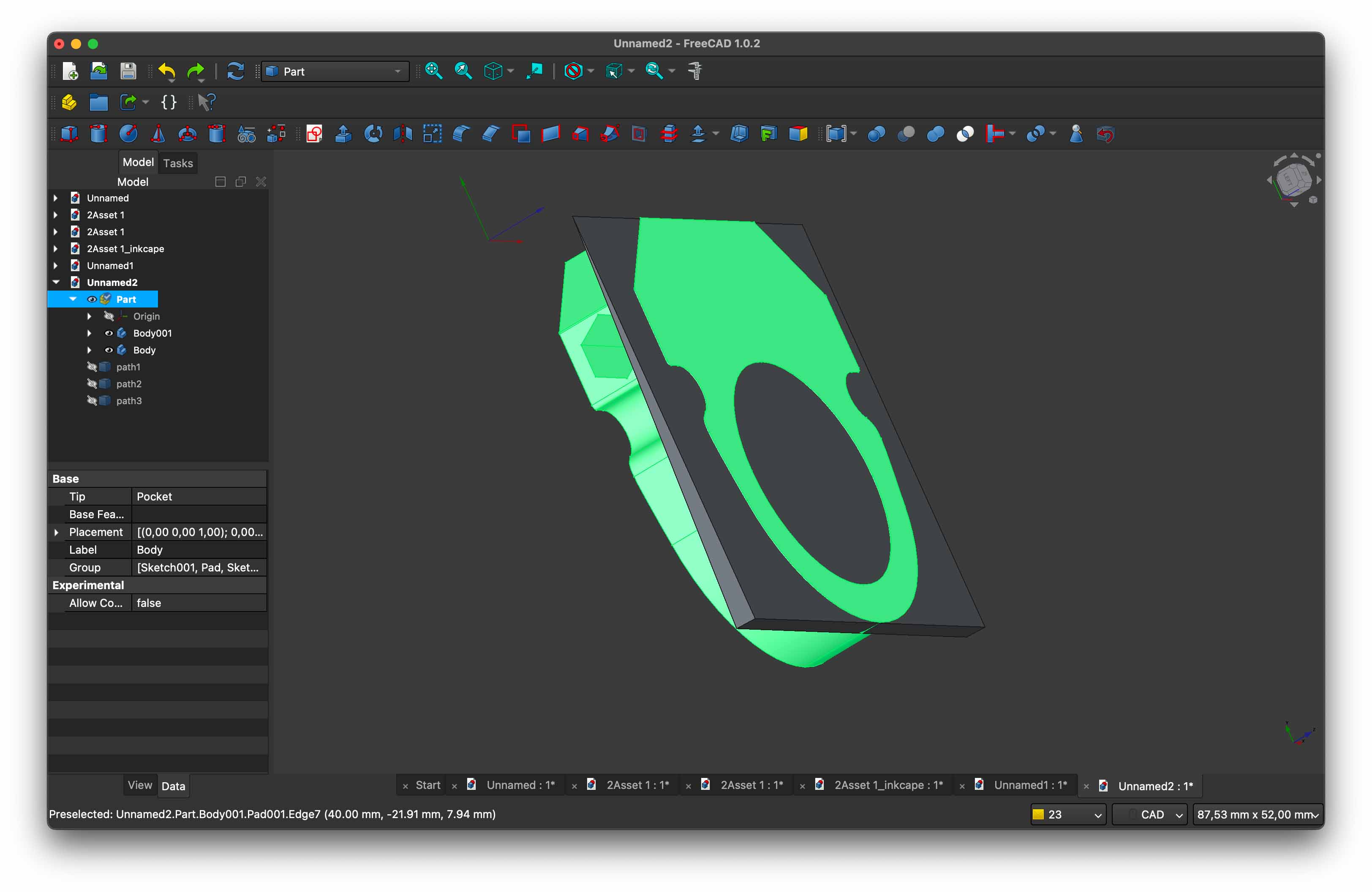 While modeling in Freecad I found myself theoretically knowing how to do things, but not understanding how to do them in Freecad. Or just being very confused by feedback the software was giving me. Looking back I was a little too excited to jump in, so I looked for very specific instructions and tried to connect the dots myself. While this was very educational, I've spent a lot of time clicking from tutorial to tutorial, shifting through bad ones or ones not applicable to my situation. This not only ate up a lot of time – far exceeding the set aside hours – it also made it really hard to focus.