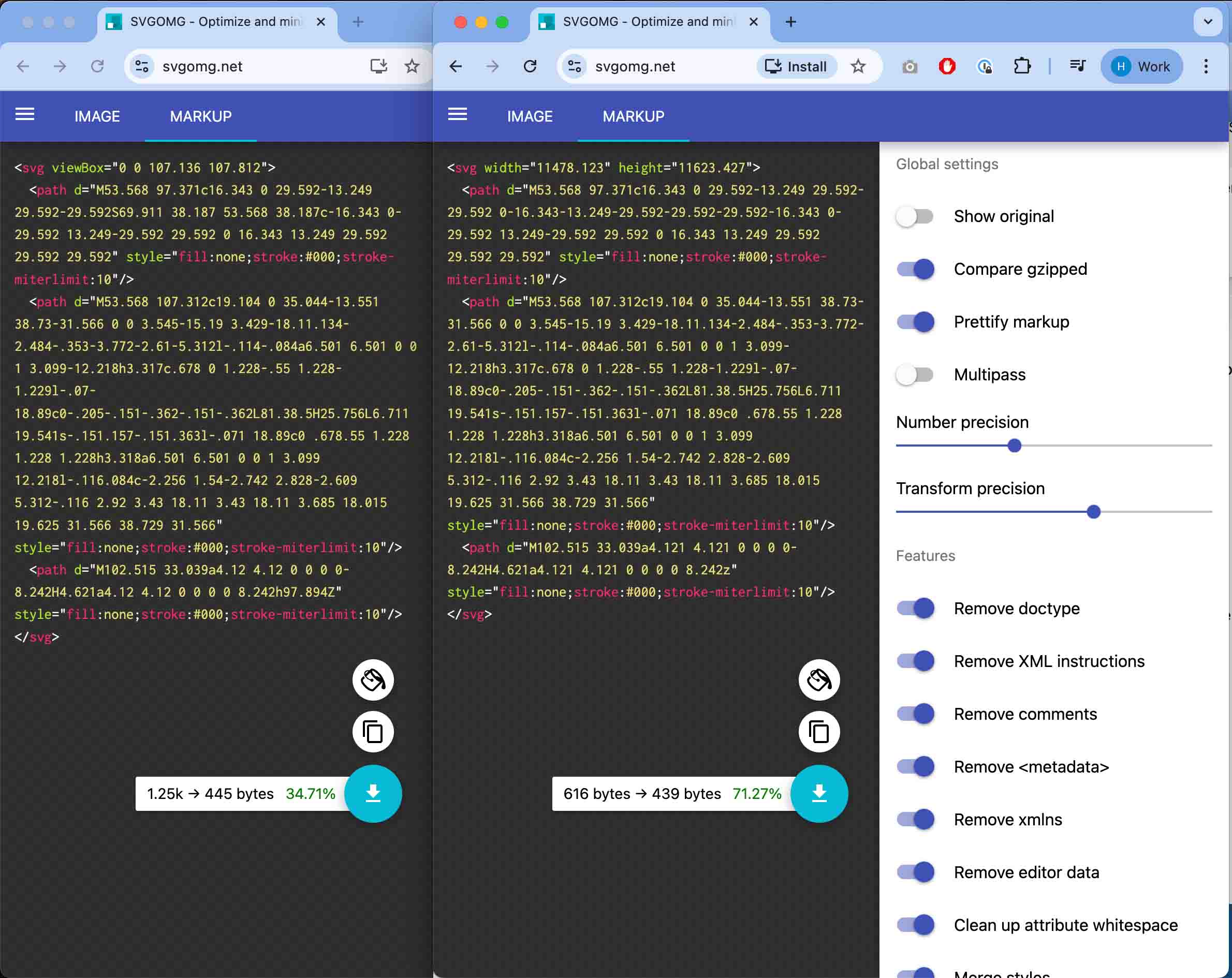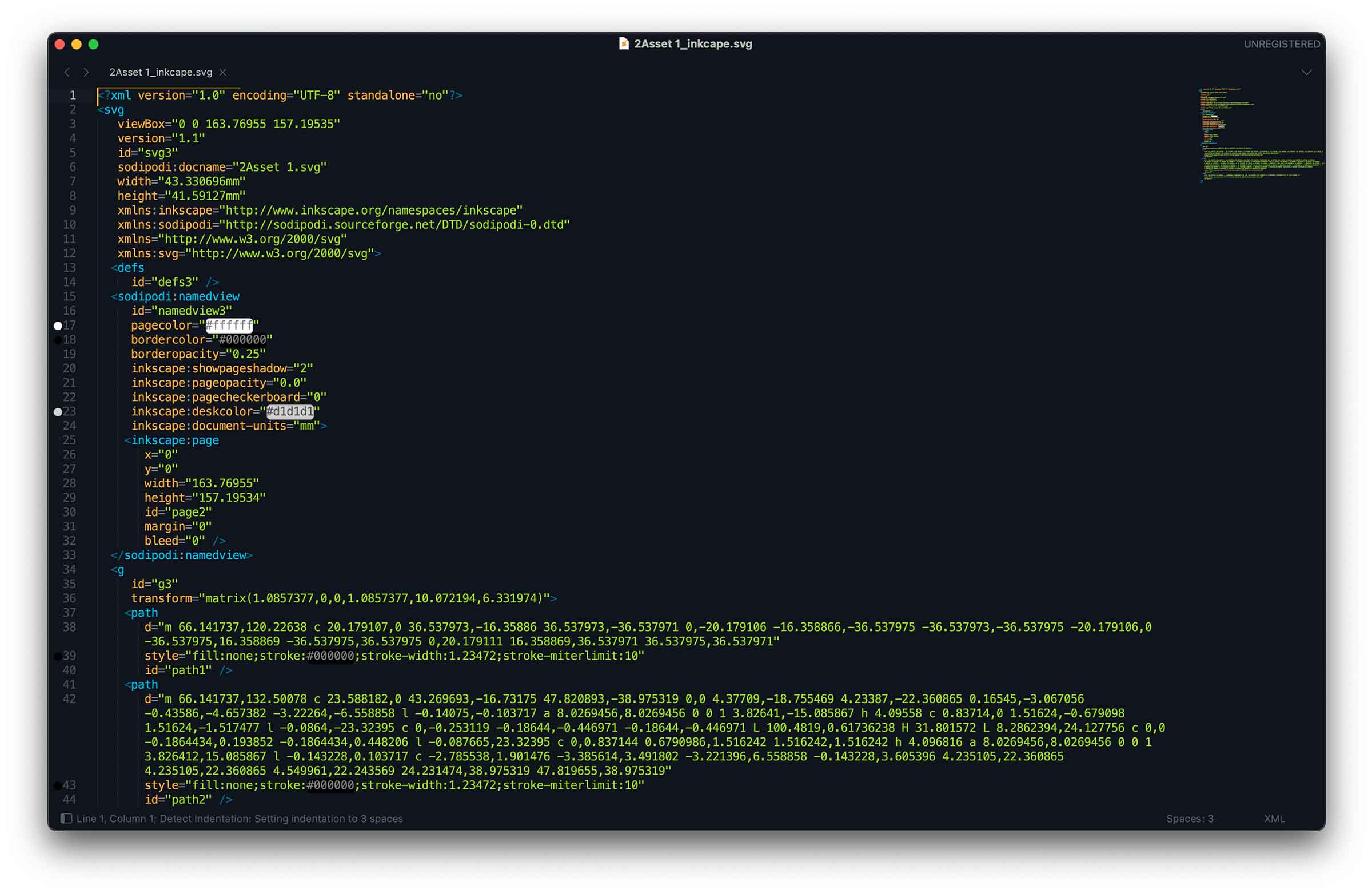 Cool, that looks good, now let's see what all the fuss is about. I export as SVG and open up the file in Inkscape. I inspect the vectors and it looks clean, I export as a regular SVG from Inkscape and use my fav SVG tool to compare the two.