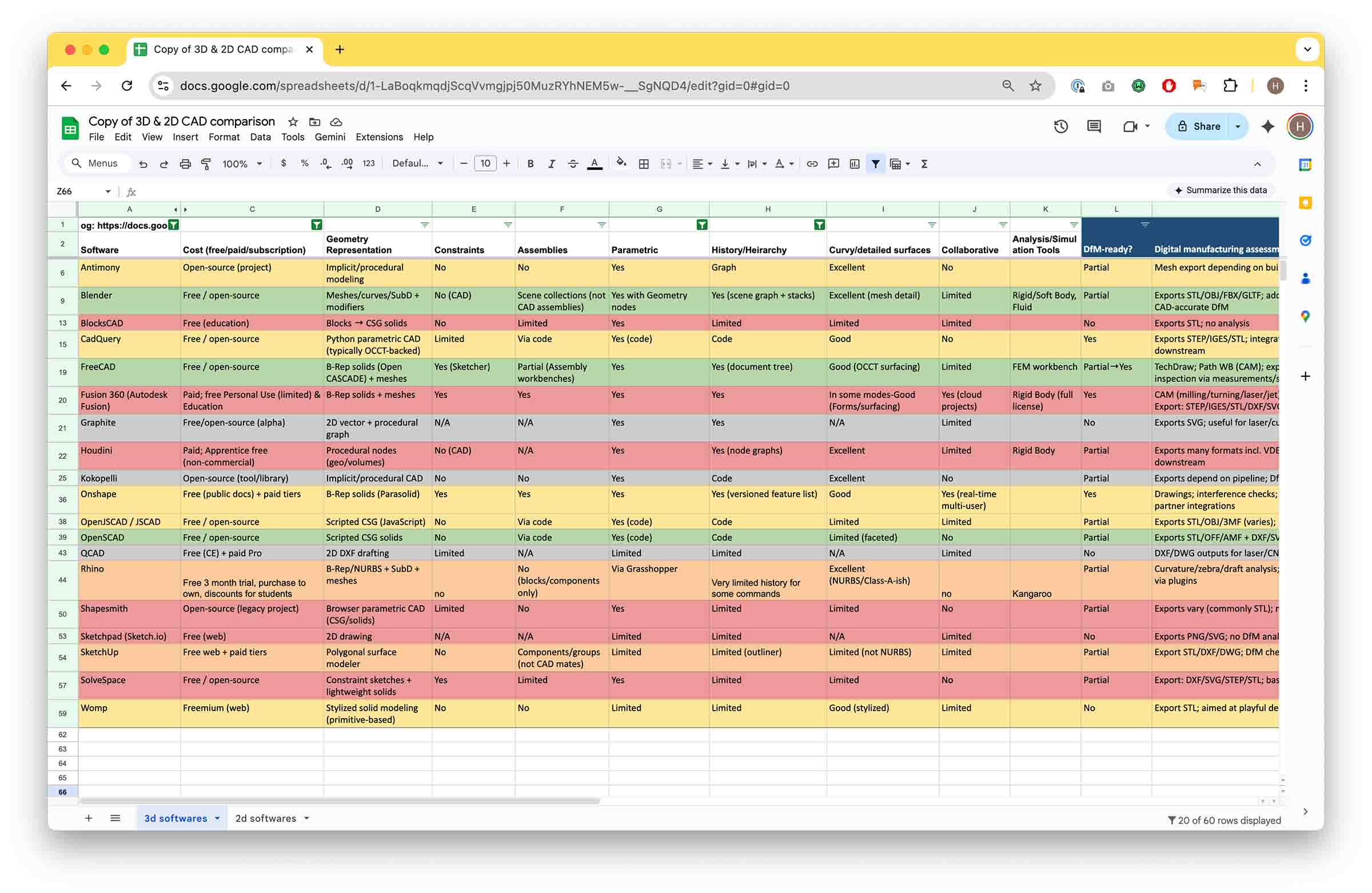 The data in the sheet isn't very clean, but scrolling through it I can see consistent patterns in the description of the columns C (Cost), G (Parametric), H (History/Hierarchy). This means I can use some Regex to filter out the tools that don't settle the requirements. I make a copy of the sheet and add my filters to these columns. I also set a filter on empty cells in column A to filter out sub-packages.