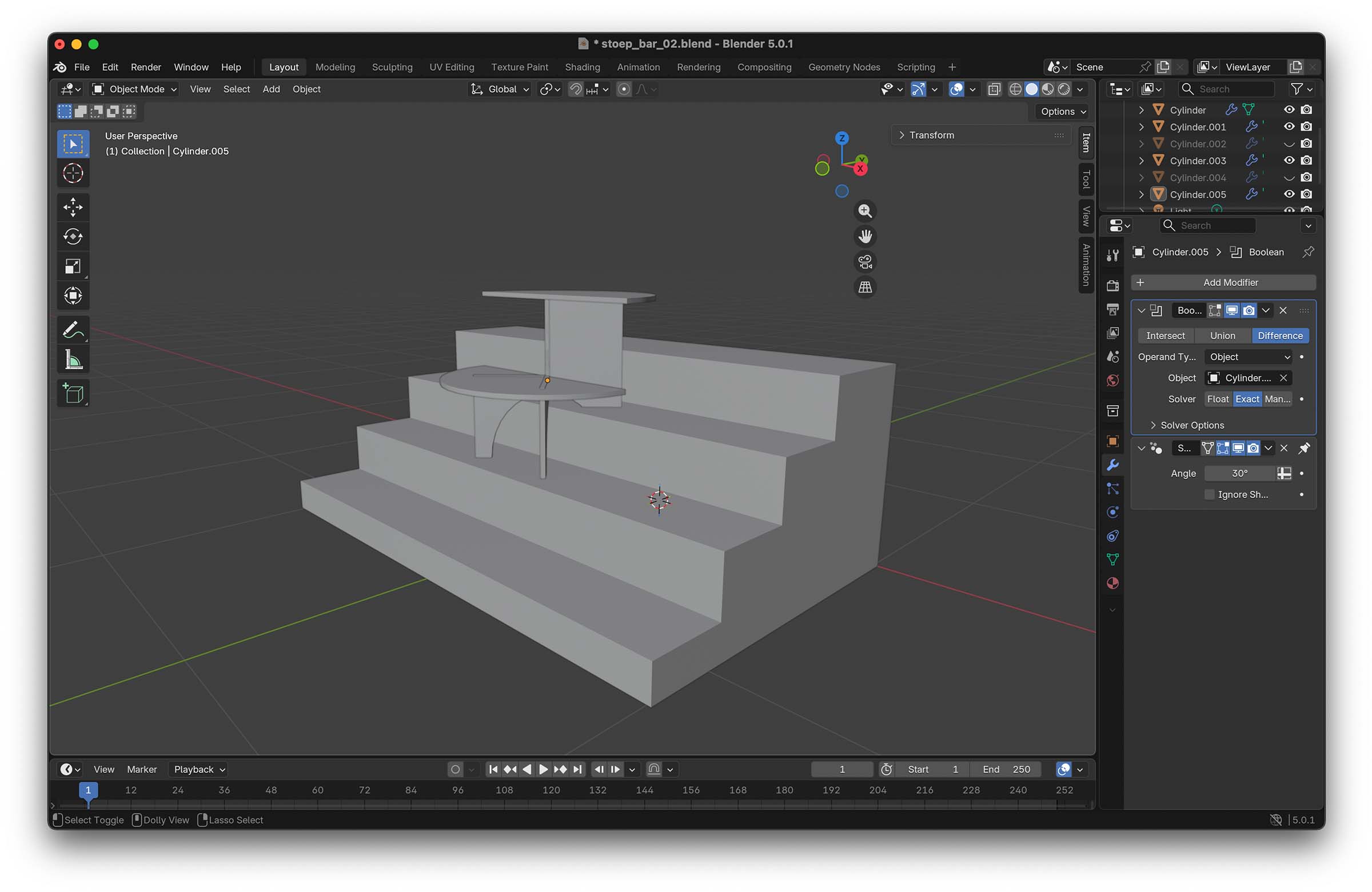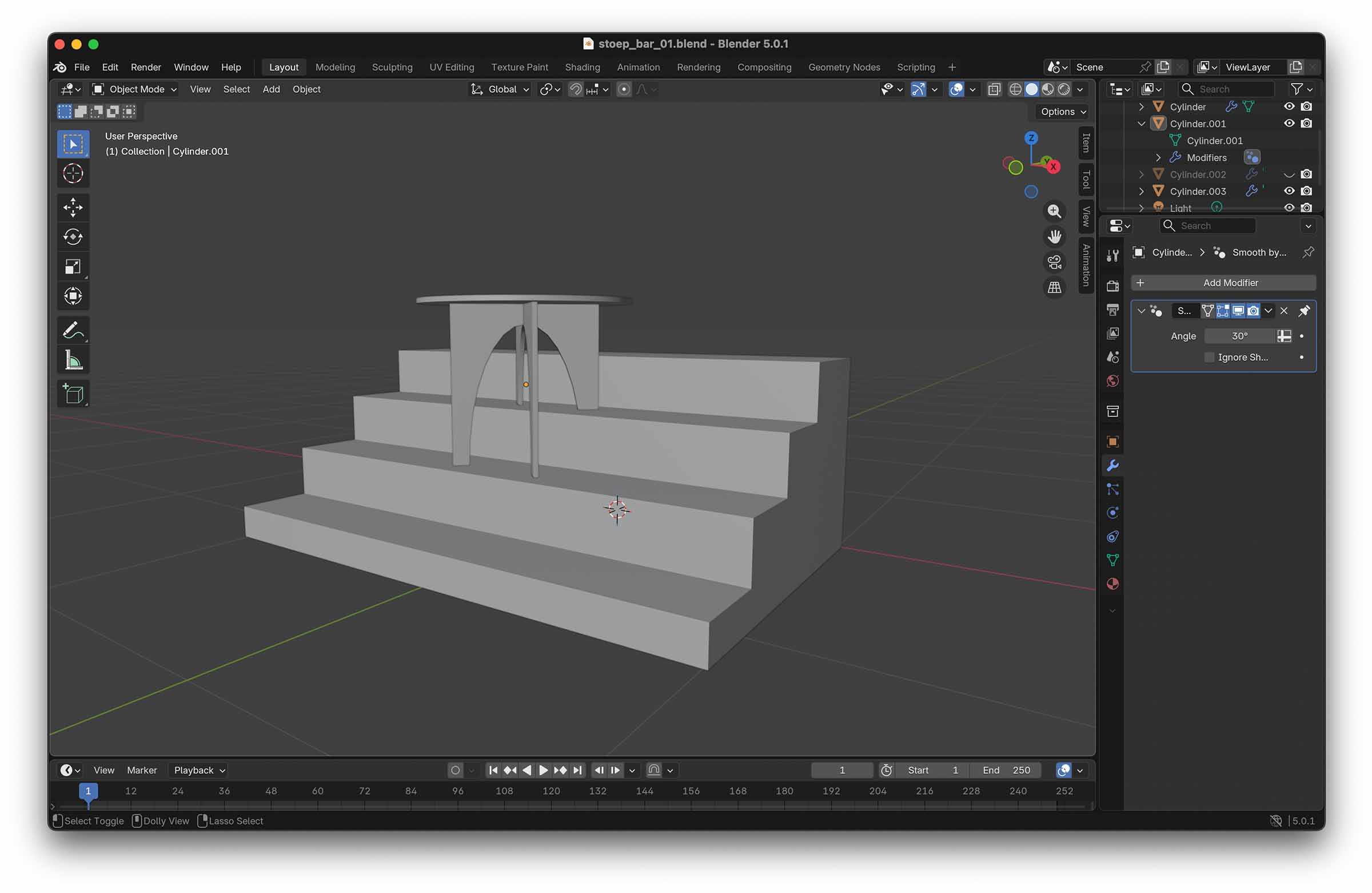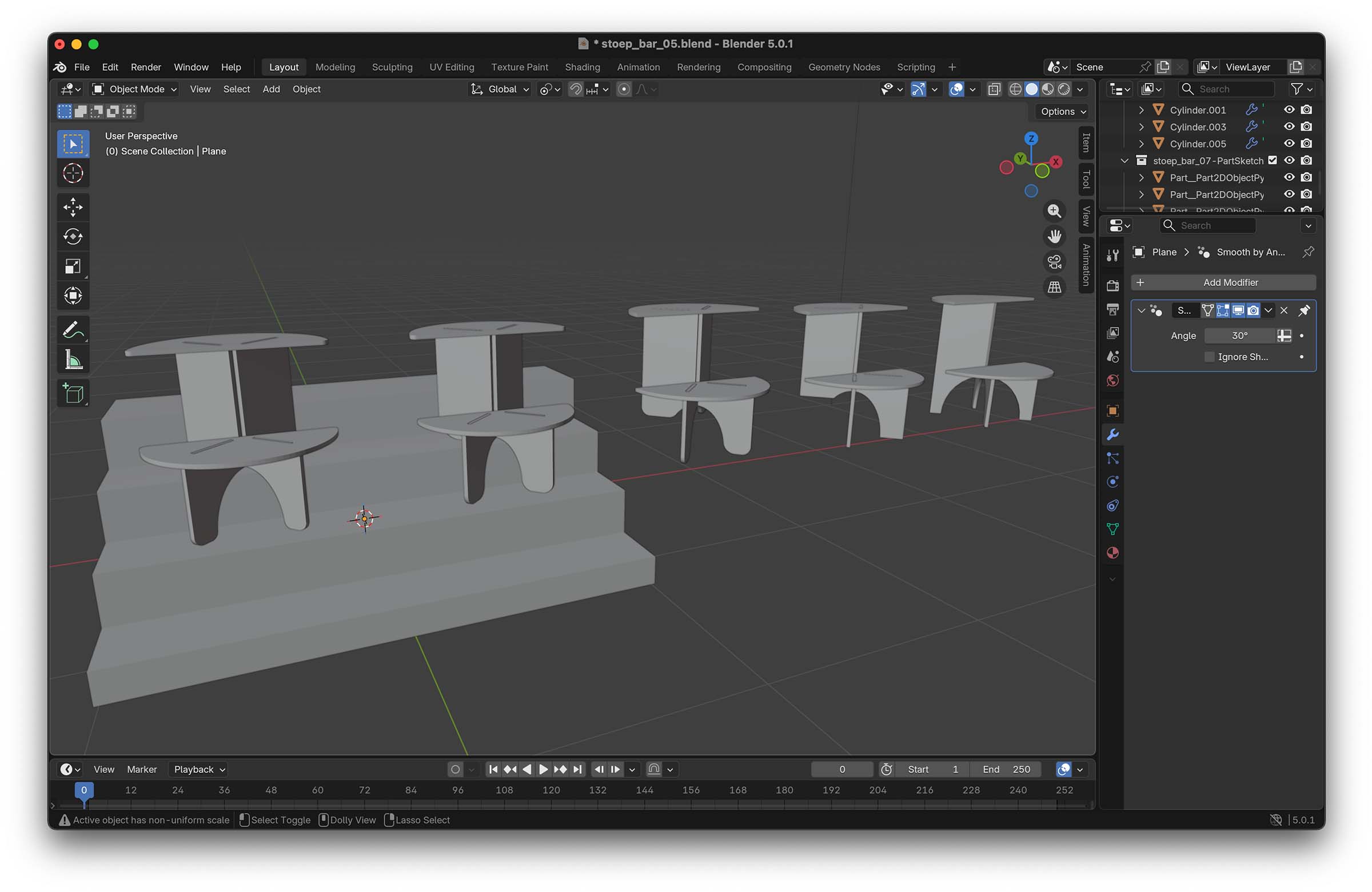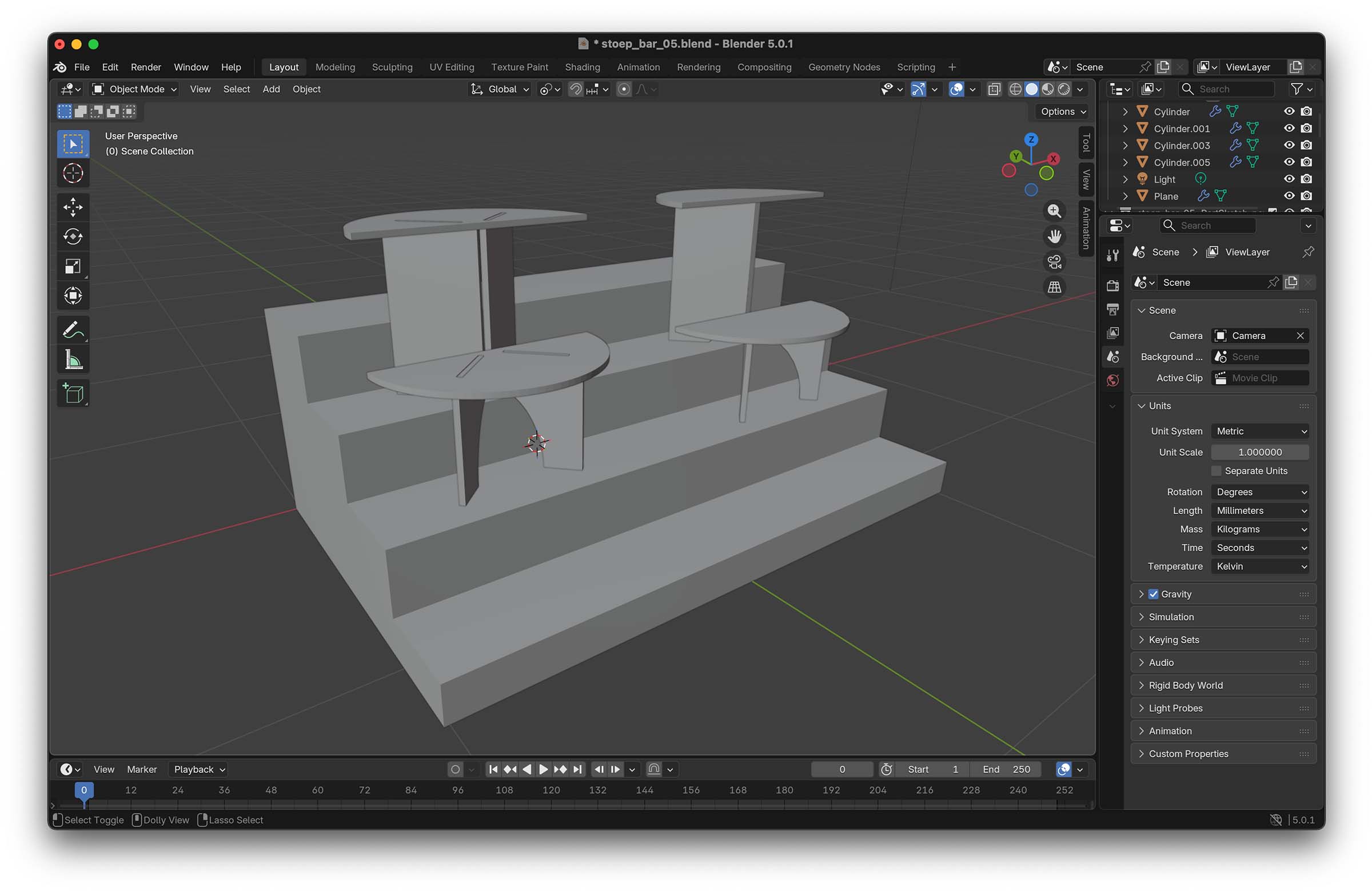 Next up I measure the stairs and model them in Blender so I can make a 3D model of my favorite sketch. Since there's an extra credit for not using fasteners or screws I decide to go with a press-fit design. I model the most basic version of a press-fit table existing of just three elements to get an idea off the scale based on the measurements I just took outside.