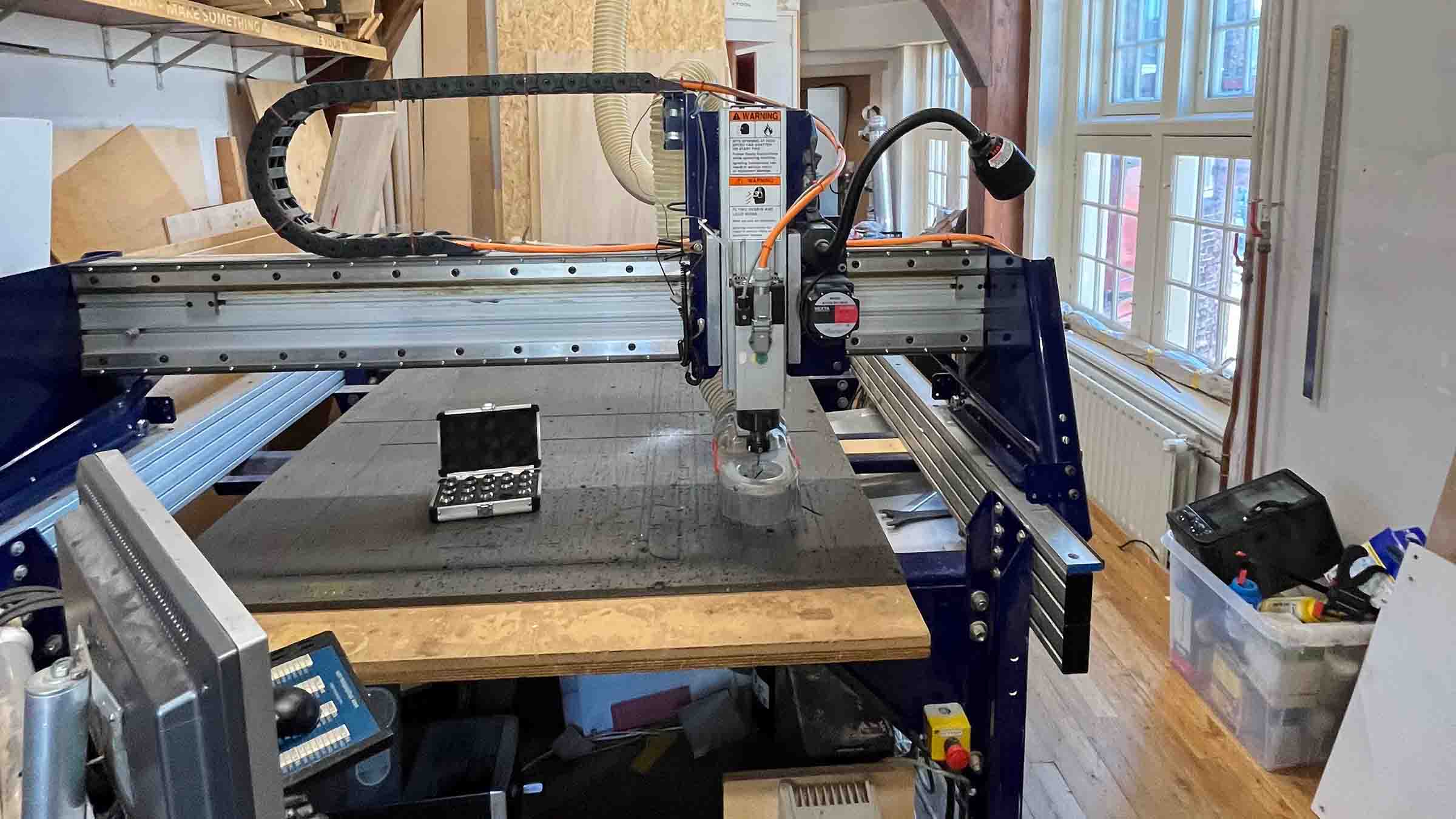 At Waag there’s a ShopBot CNC: a big and slightly dangerous machine with a 20-year-old controller, a computer running VCarve and the ShopBot software, and a maximum spindle speed of 18,000 RPM. The largest material you can load is 2.50 × 1.30 × 0.20 m. It’s very precise and has no real limits — it will happily try to do whatever you tell it to do. That’s why it’s important to know how to use this beast safely, so Henk and Saco walked us through the safety procedures.