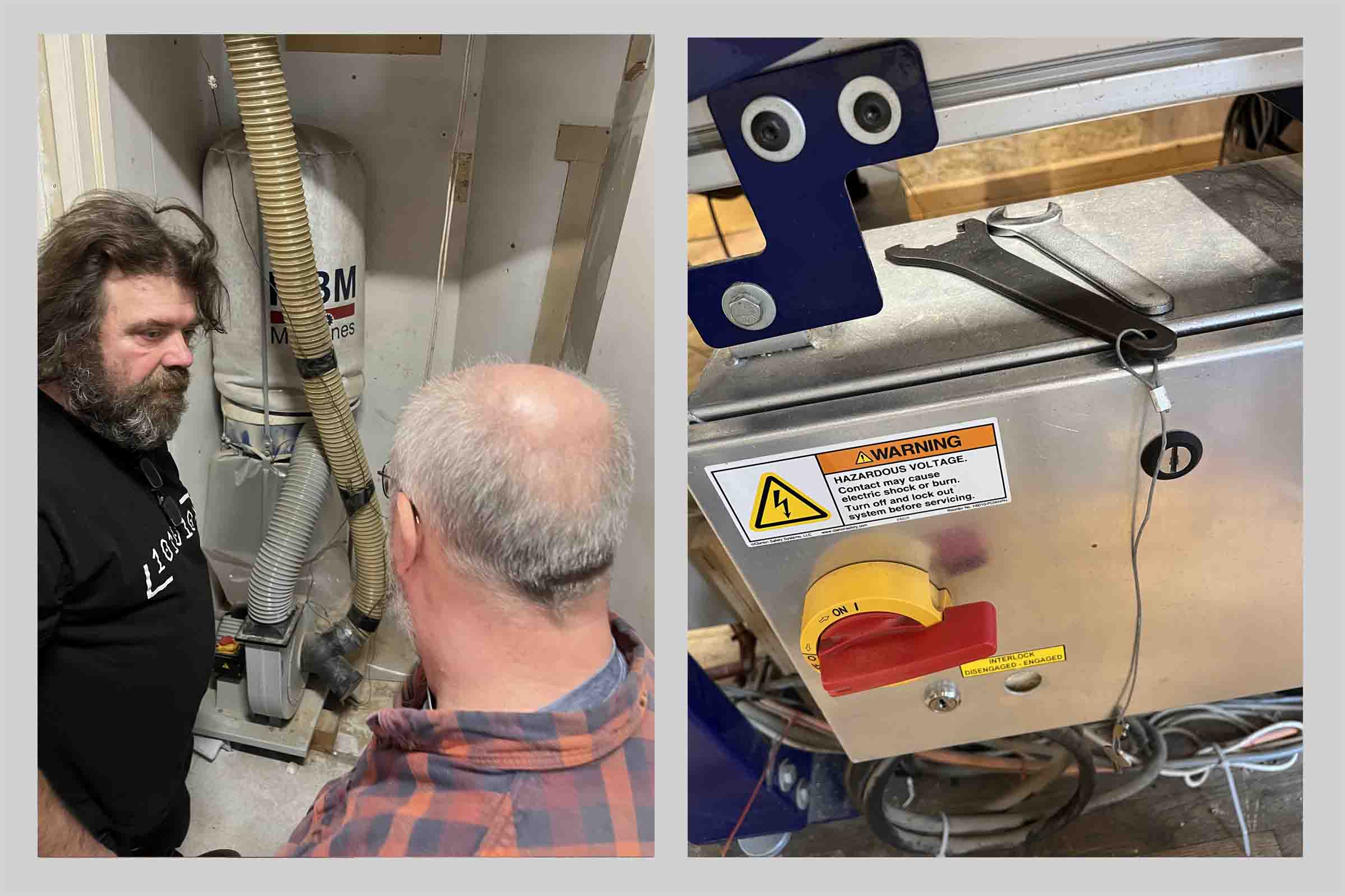 Also always make sure you move around the machine freely and none of the material in the storage around the machine is restricting the movement of the bridge and spindle head. When working with two people there should always be one person in the lead. Only this person is allowed to touch and control the machine, the other person just assists and moves away from the machine when it's running.