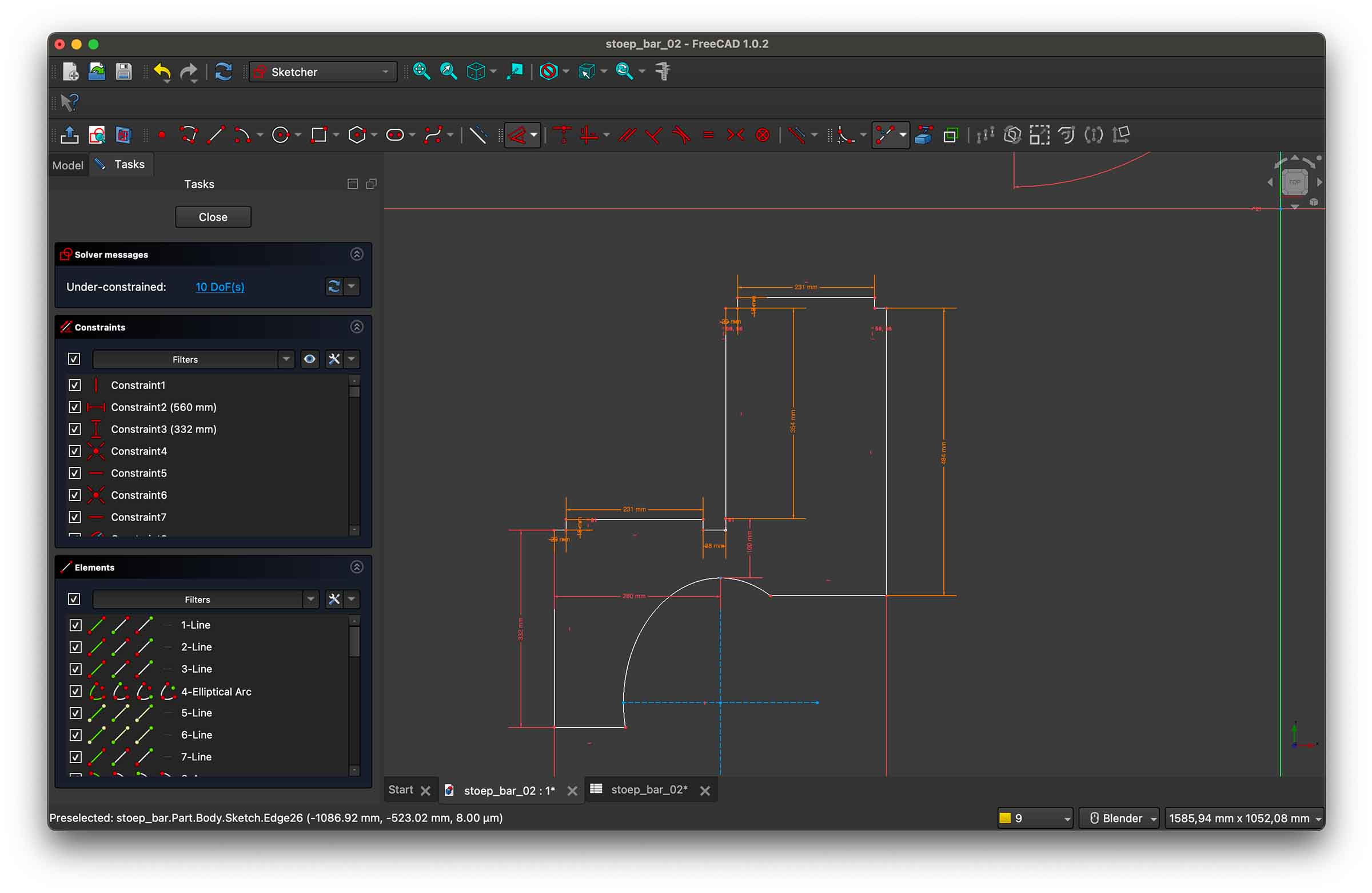 Once I've drawn the two basic shapes, one leg and half a circle for the top, I proceed by taking little notches out of the tabs of the legs for extra stability. Of course this means I also need to update the slots in the top. Since it's very important I don't make mistakes in this part I add some parameters in a spreadsheet in Freecad for the material width, notch size, leg size, etc.