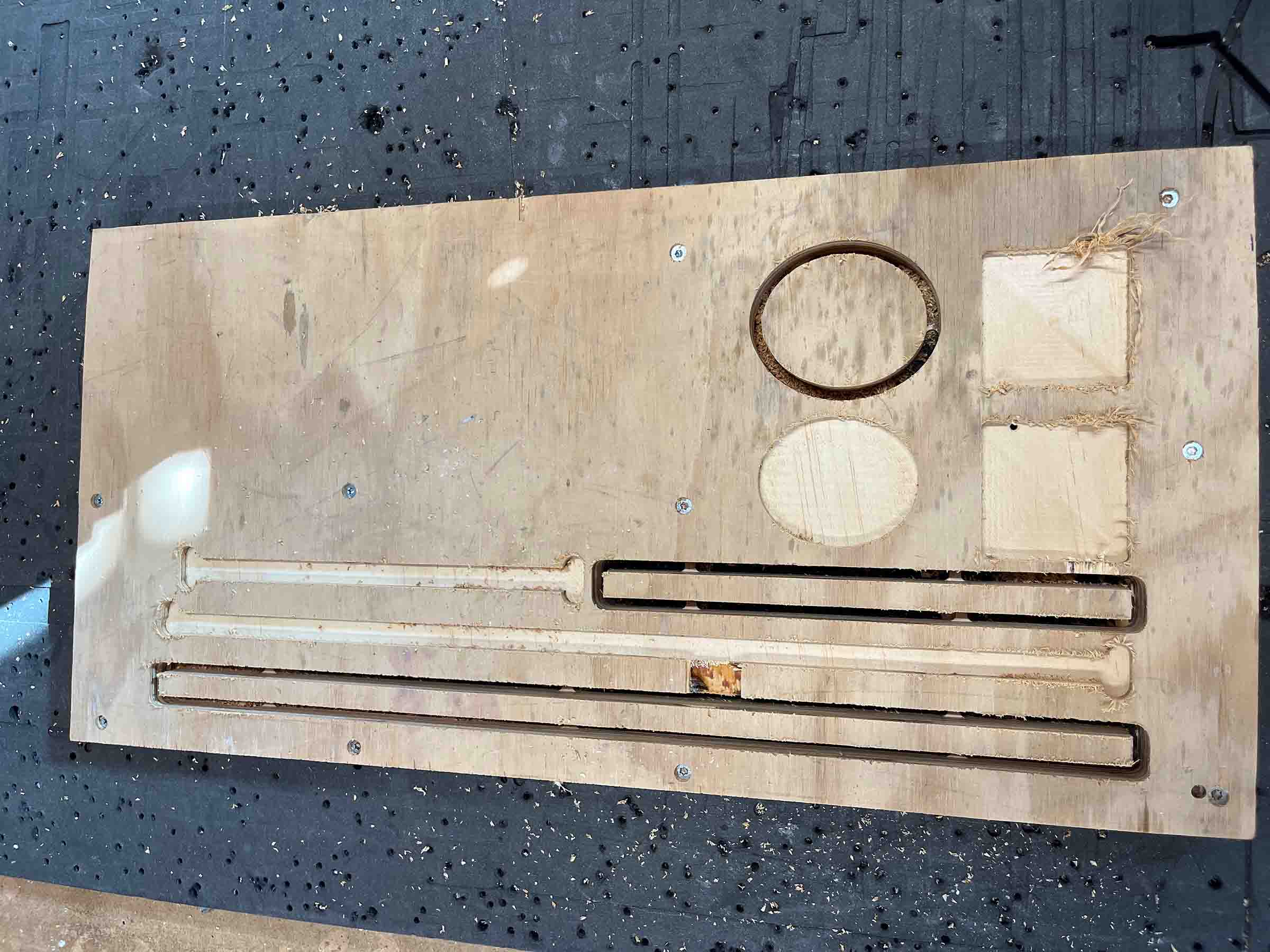 The top right pocket was set to a speed of 80mm/s, the rest 60mm/s. You can see it's mostly pretty clean, some areas going against the grain are quite messy, we suspect the wood was in worse condition there since this is an old bit of material and you can see some moist staining.