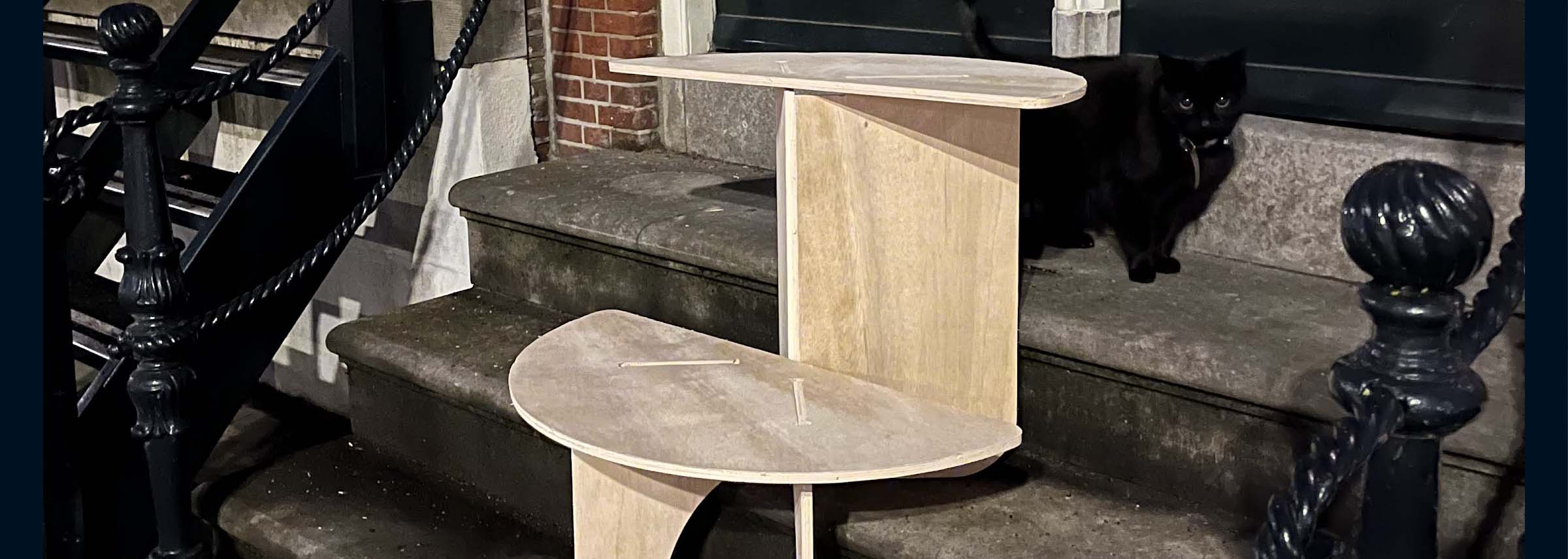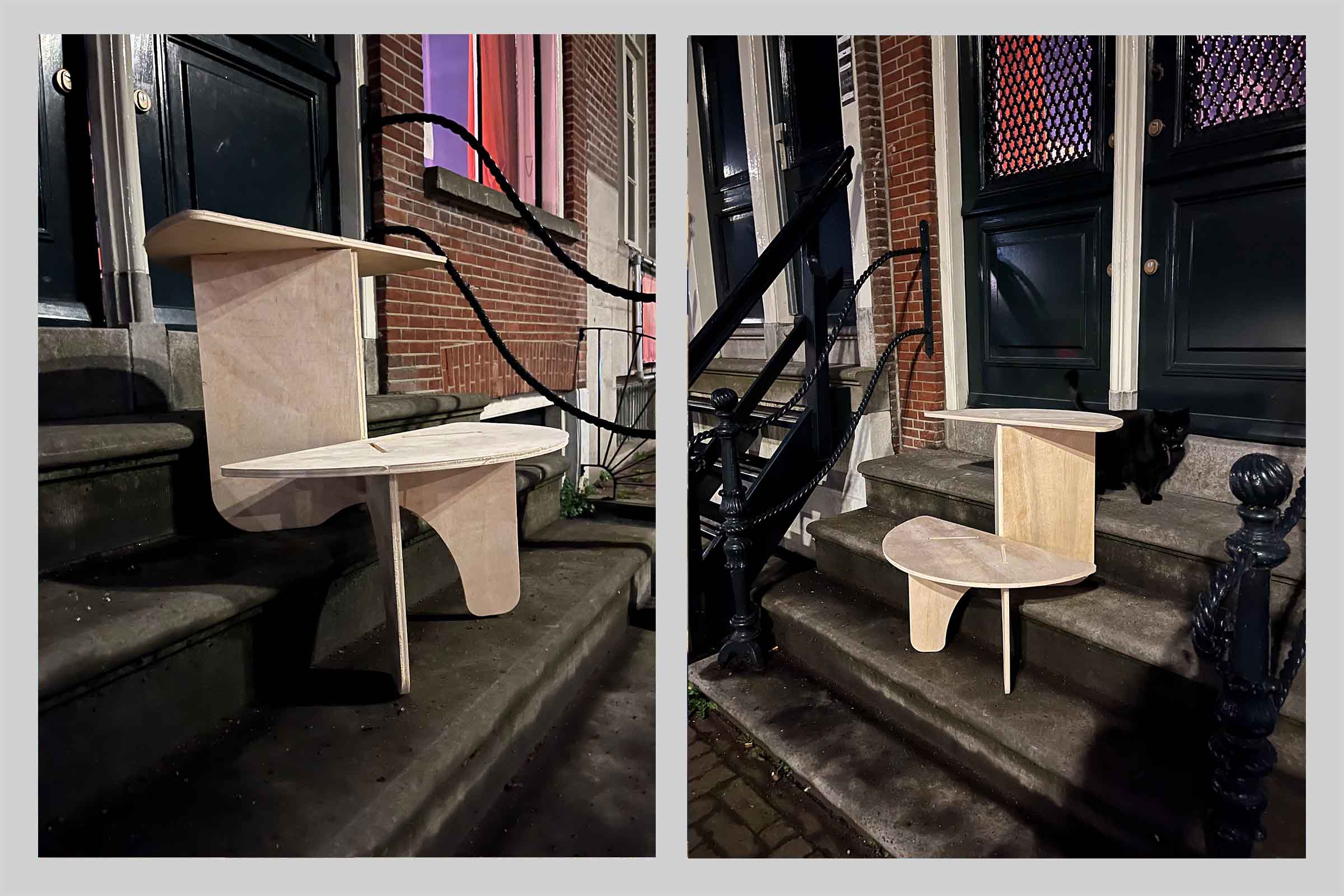 In front of my house there are a few steps where I often sit in the sun, reading a book or having a drink with friends. It’s a familiar scene across Amsterdam whenever the weather is nice. The one thing that’s always missing is a small surface to put things on. Drinks end up on the steps and regularly get kicked over when someone stands up. The steps are often sandy, and when I’m working on a crafting project I’d rather not place my materials directly on them. There have been solutions popularized throughout the city to make our semi public spaces more enjoyable.