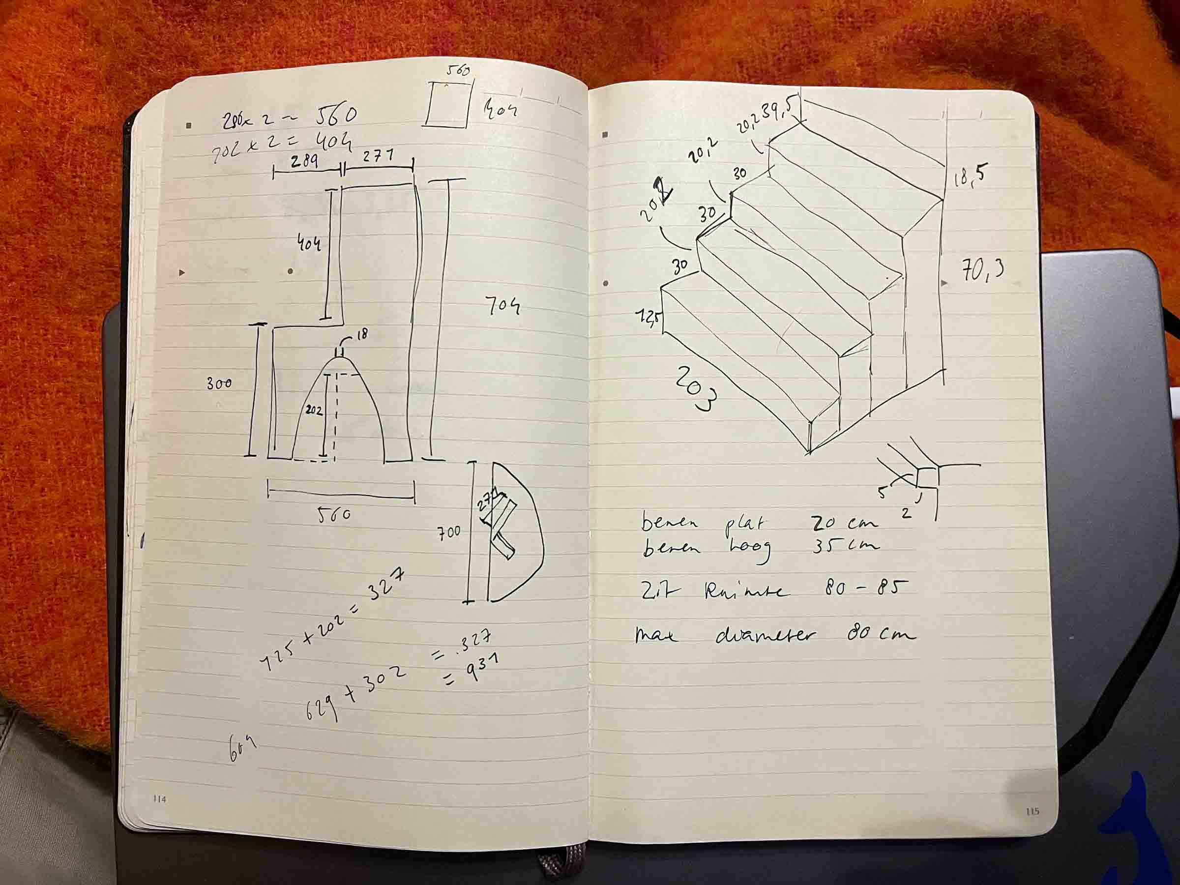 This I think is kinda cool, it would still only require four elements, can be easily put up, taken down and stored away. I have some questions about the structural integrity, but decide it's worth the try. Next I play around with the size and scale until the table looks appropriate relative to the stairs. The final design needs to be very precise and Blender doesn't do great at technical drawings, so I draw out the elements and their sizes in my sketchbook and switch to Freecad.
