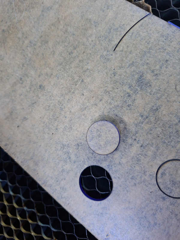 Three circular test cuts with different diameters were designed. For each test, the designed diameter, measured hole diameter, and measured cut-out piece were recorded. The kerf was calculated as: