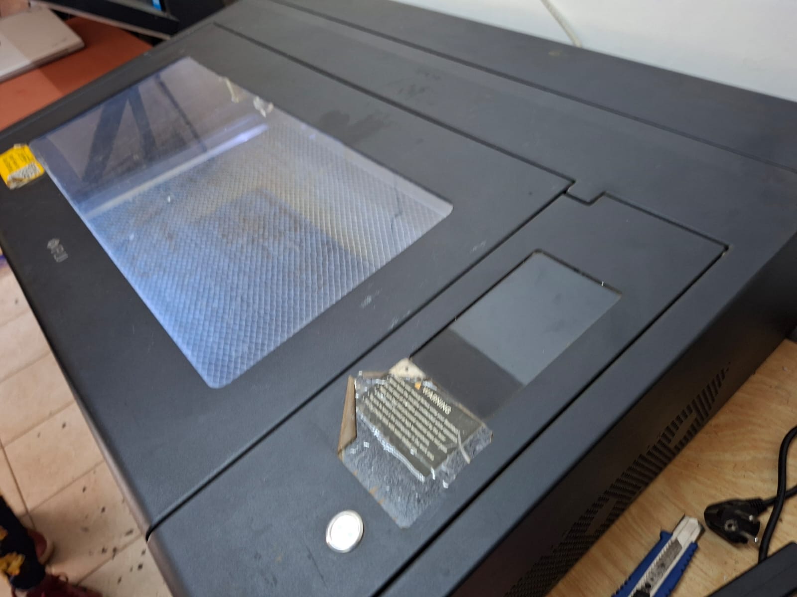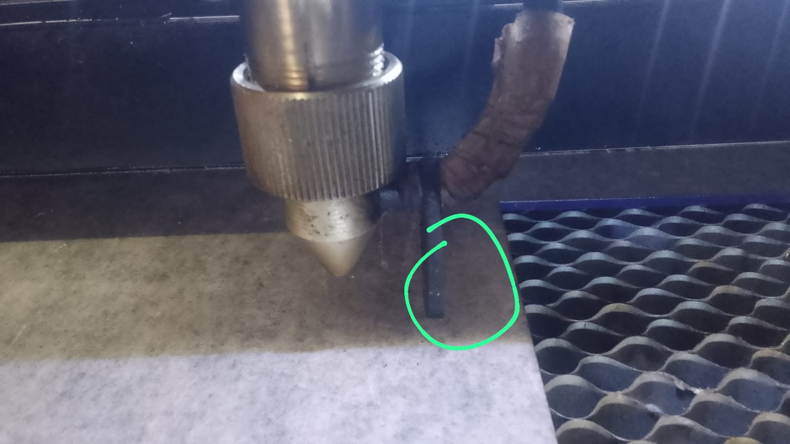 Before cutting, the laser was manually focused because the machine does not support automatic focus. The focus was set by loosening the focus mechanism and adjusting the honeycomb bed height until it touched the acrylic workpiece. This ensured the laser was correctly focused on the material surface.