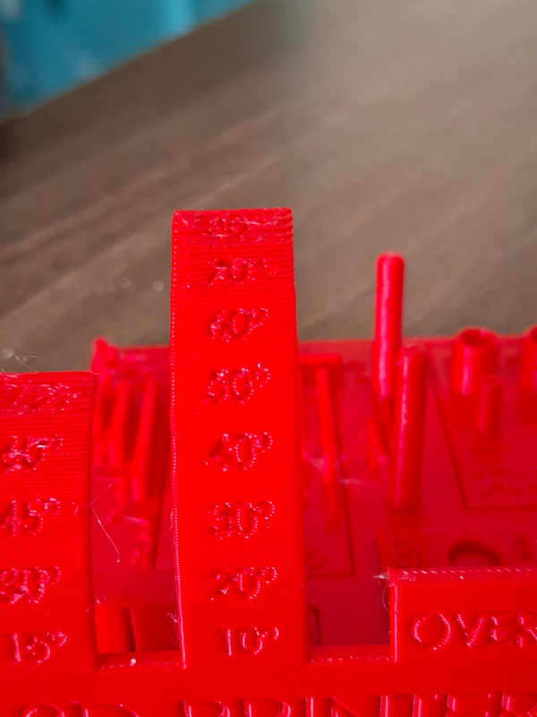 • overhangs The printer handled moderate overhang angles well (up to ~80°). However, at steeper angles, slight sagging was observed.