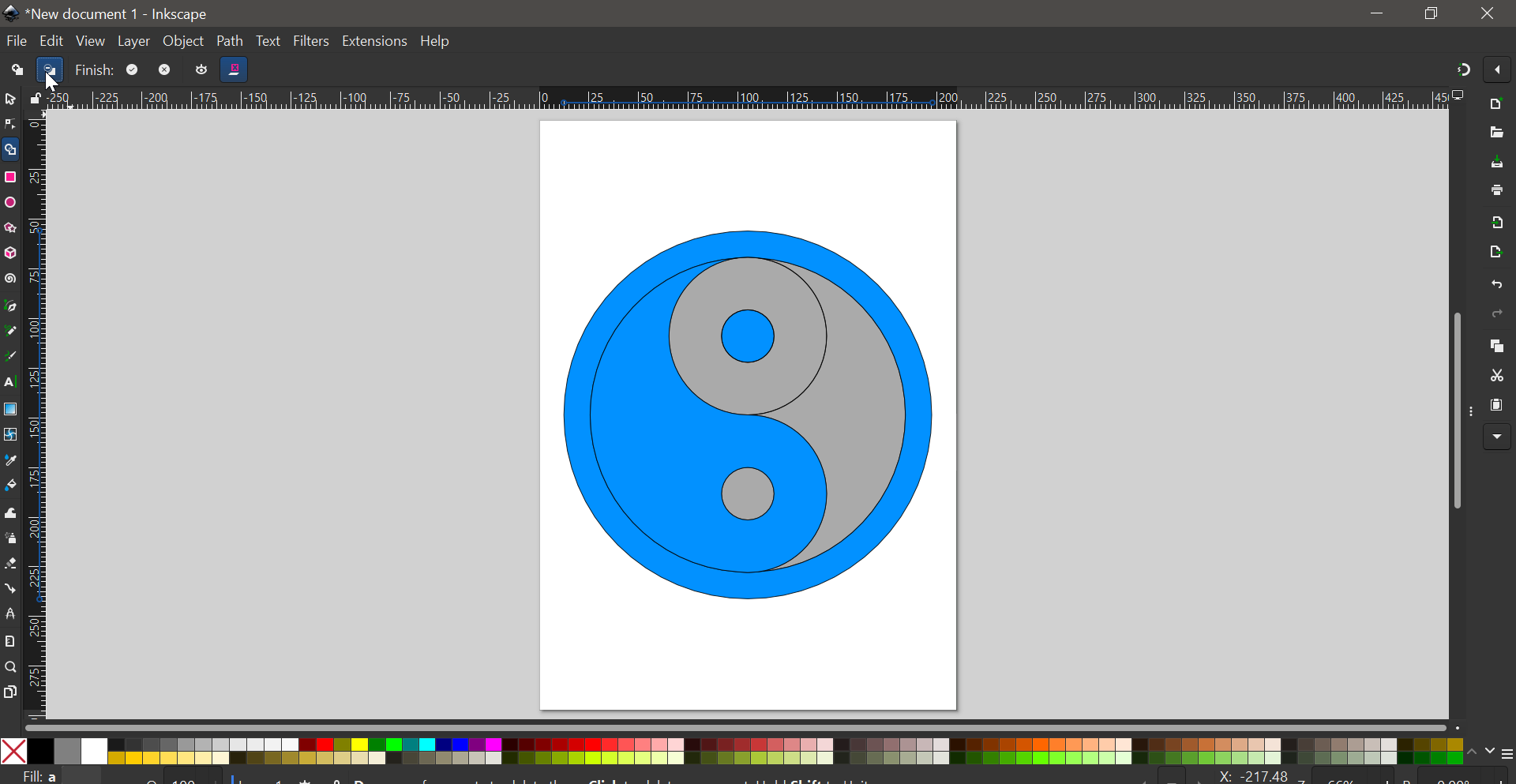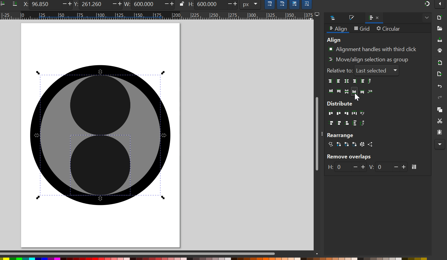 To create the Yin Yang symbol, I used the same duplication and alignment techniques learned earlier and watch this vedio from youtube https://www.youtube.com/watch?v=fzk-suGcqrc. I started by drawing circles of different sizes and duplicating them. I aligned them along the vertical axis to make sure I was working from the exact center of the page. When aligning shapes, I selected both objects using the Shift key, then set “Relative to: Last selected” so they aligned correctly.