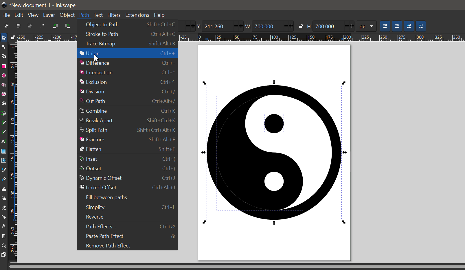 Once the design looked correct, I selected all the remaining parts and used Path → Union to combine everything into a single object.