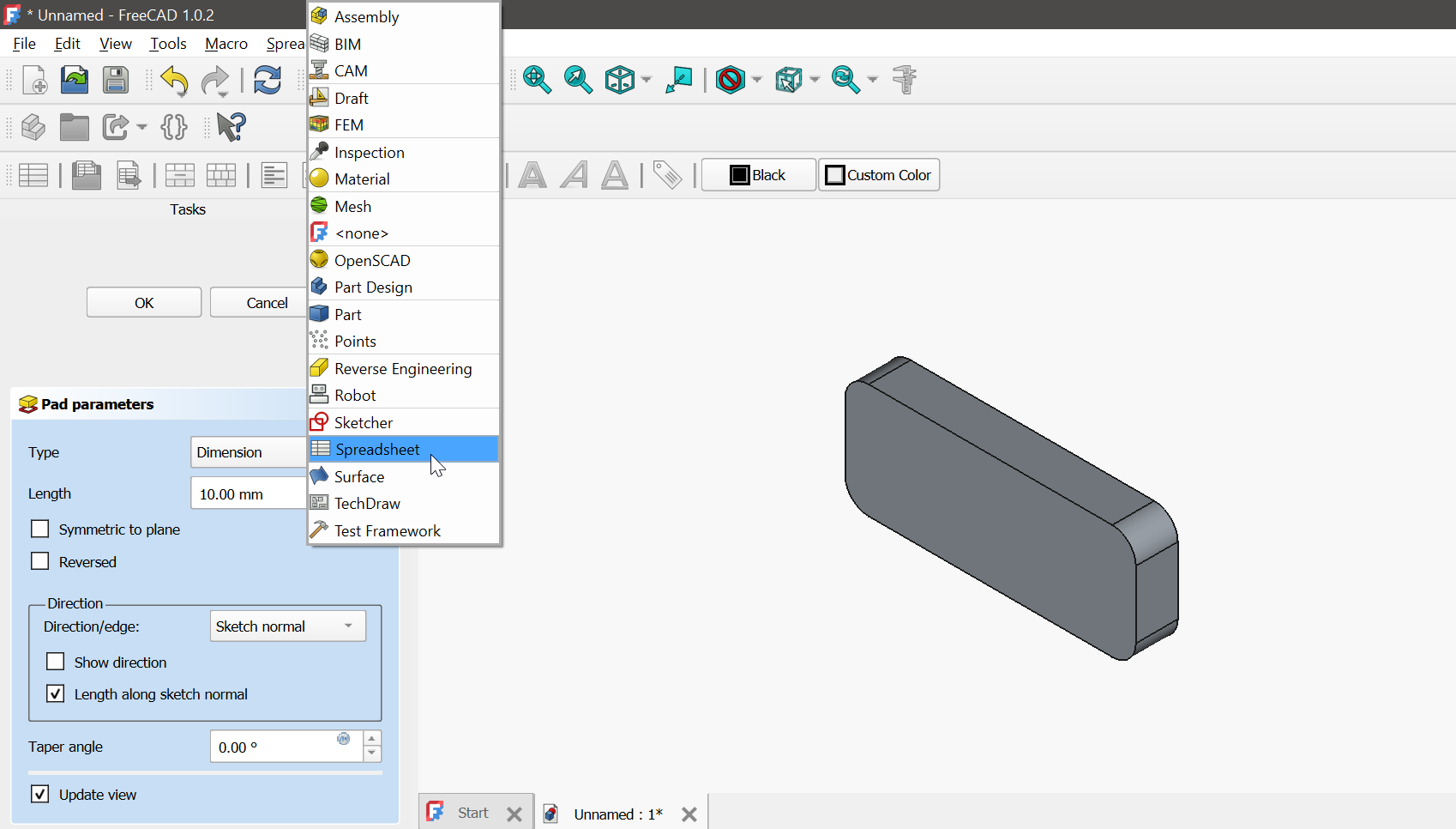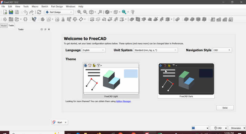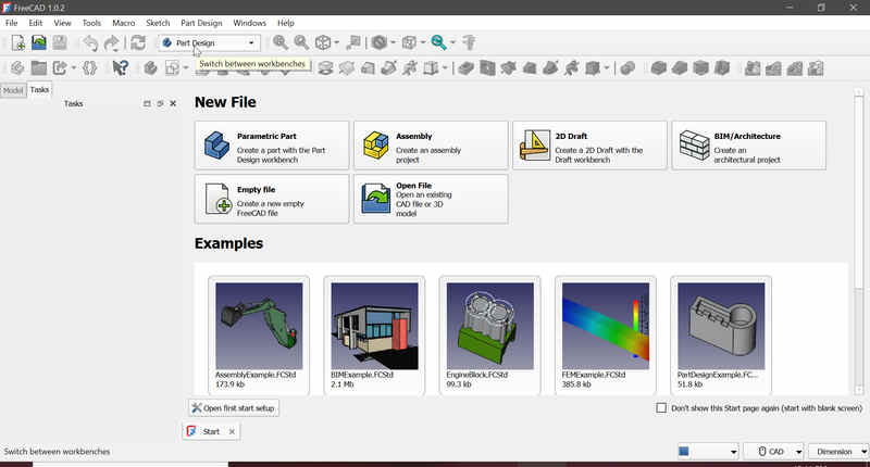 I started FreeCAD after installation and chose the Part Design Workbench, which is frequently used for parametric solid modeling.