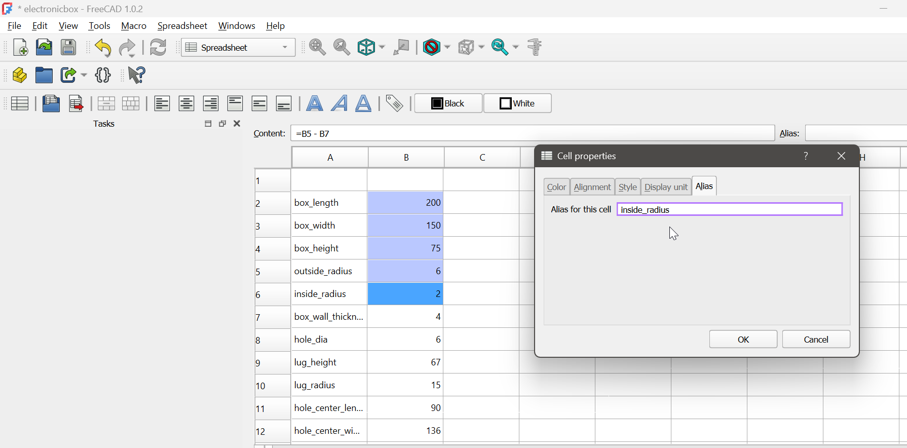 I assigned aliases (names) to these cells (for example: Length, Width, Height, Thickness).