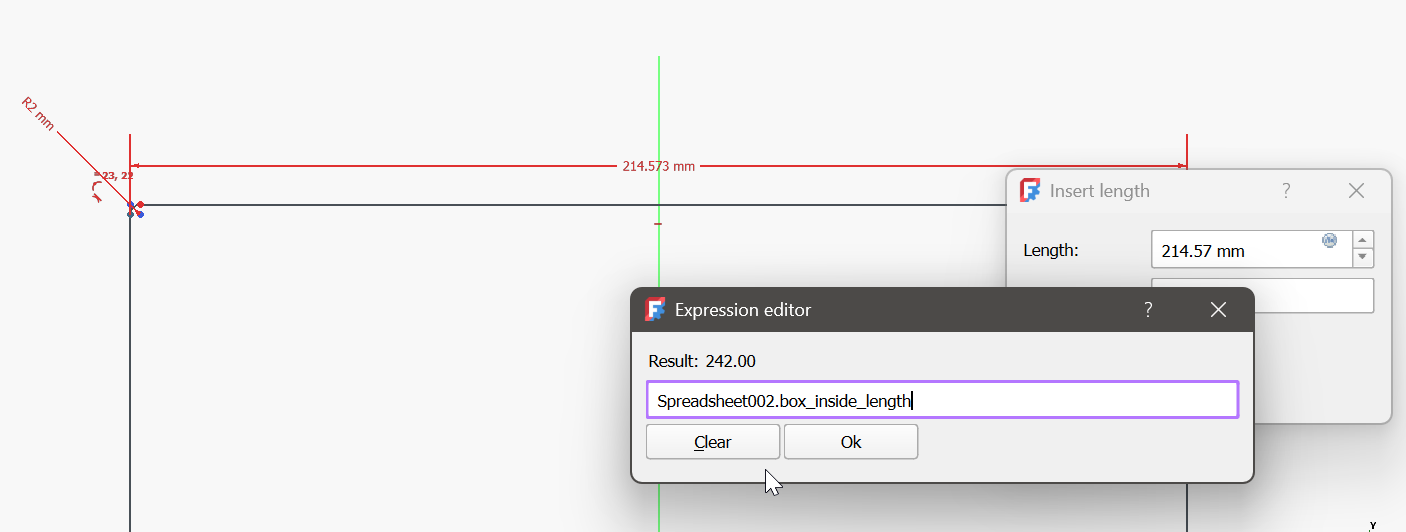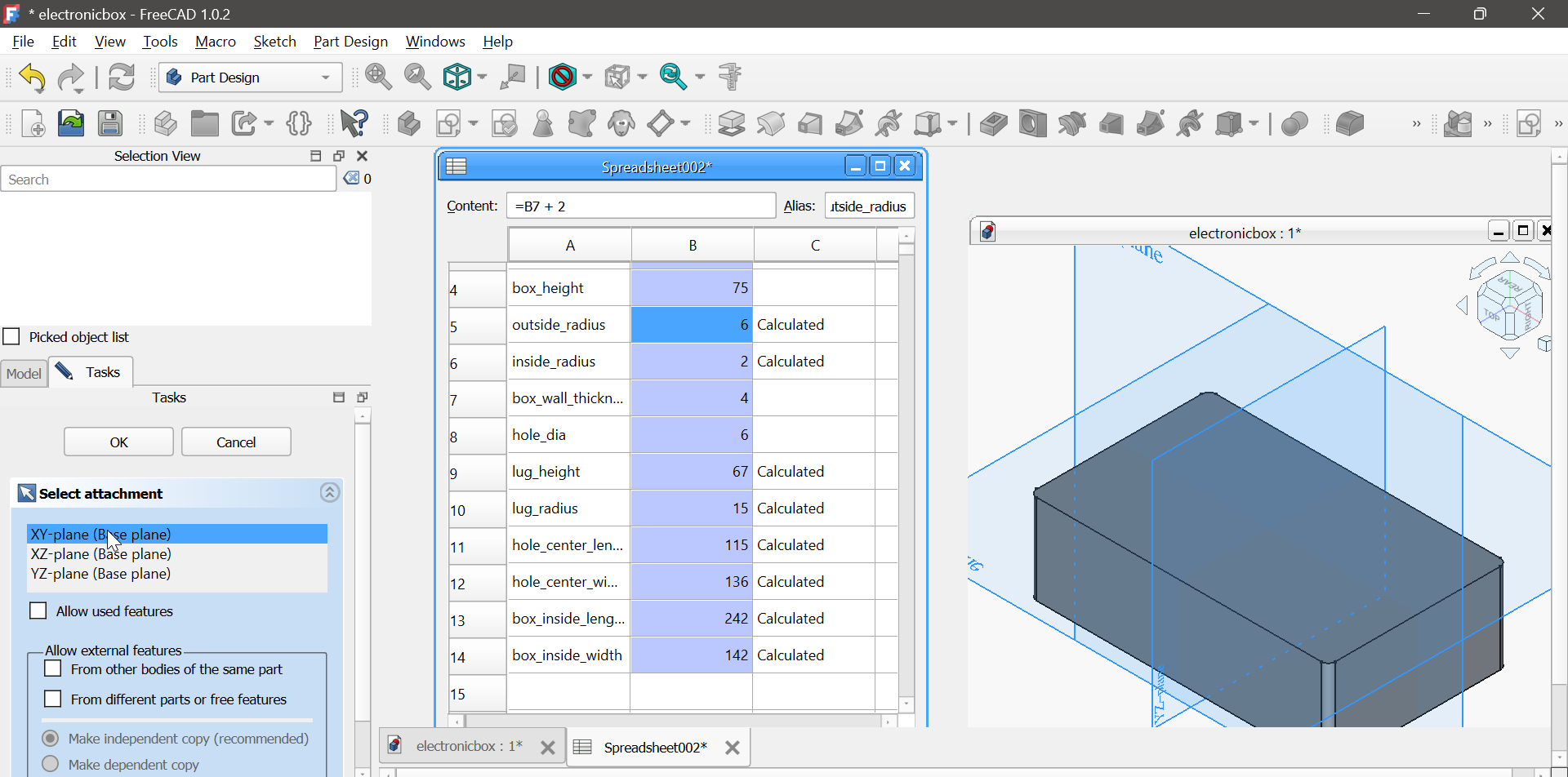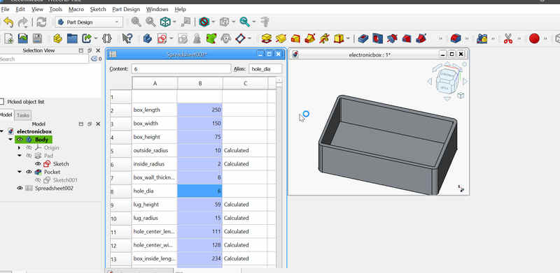By simply changing values in the spreadsheet (length, width, height, wall thickness), the entire box updates automatically.