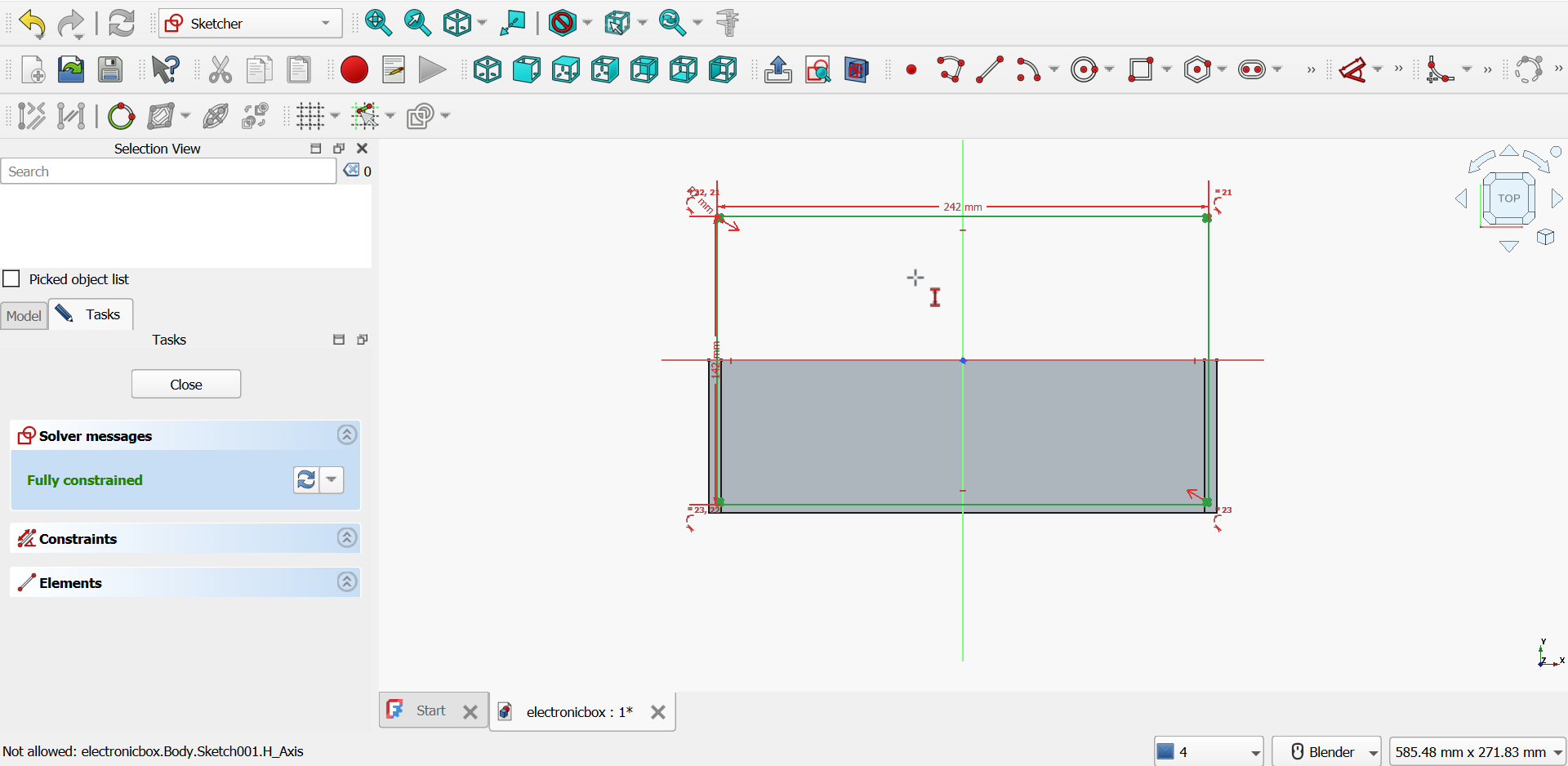 Once all degrees of freedom were removed, the sketch turned green, meaning it was fully constrained. I then went back to the 3D model view by clicking Close.