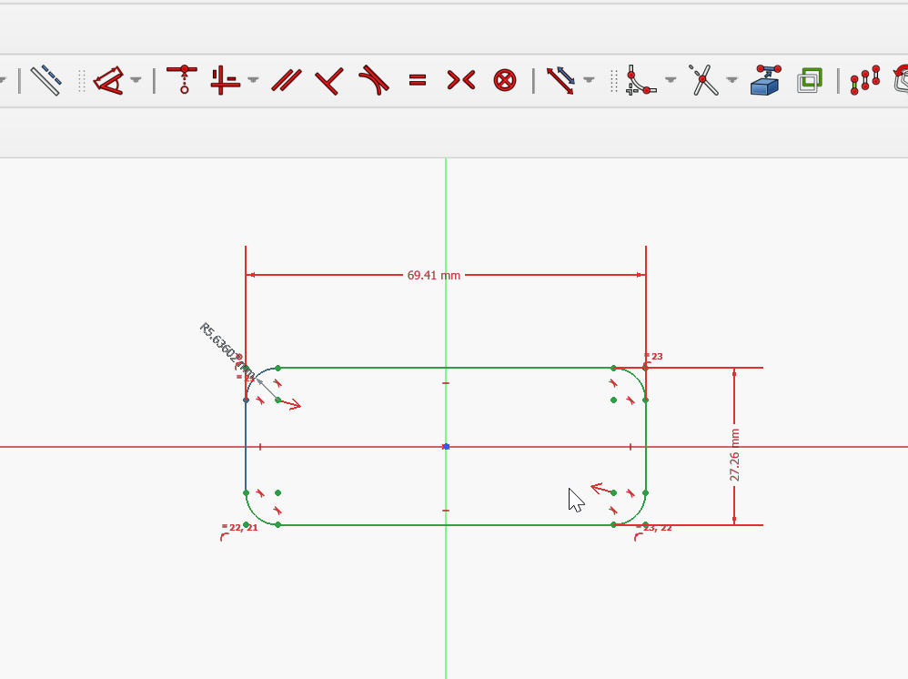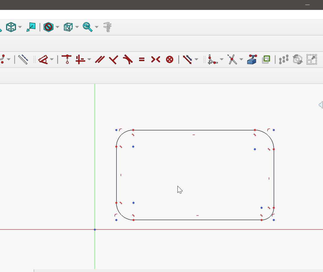 I used radius tool to round the corners by clicking two lines to curve the corners and the Equal constraint to ensure that all corner radii were equal.