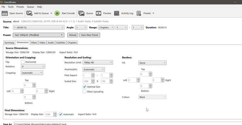 Under the Video tab, set the framerate to 30 fps and select Constant Framerate. Adjust the Quality (RF) — higher values reduce file size but decrease quality: