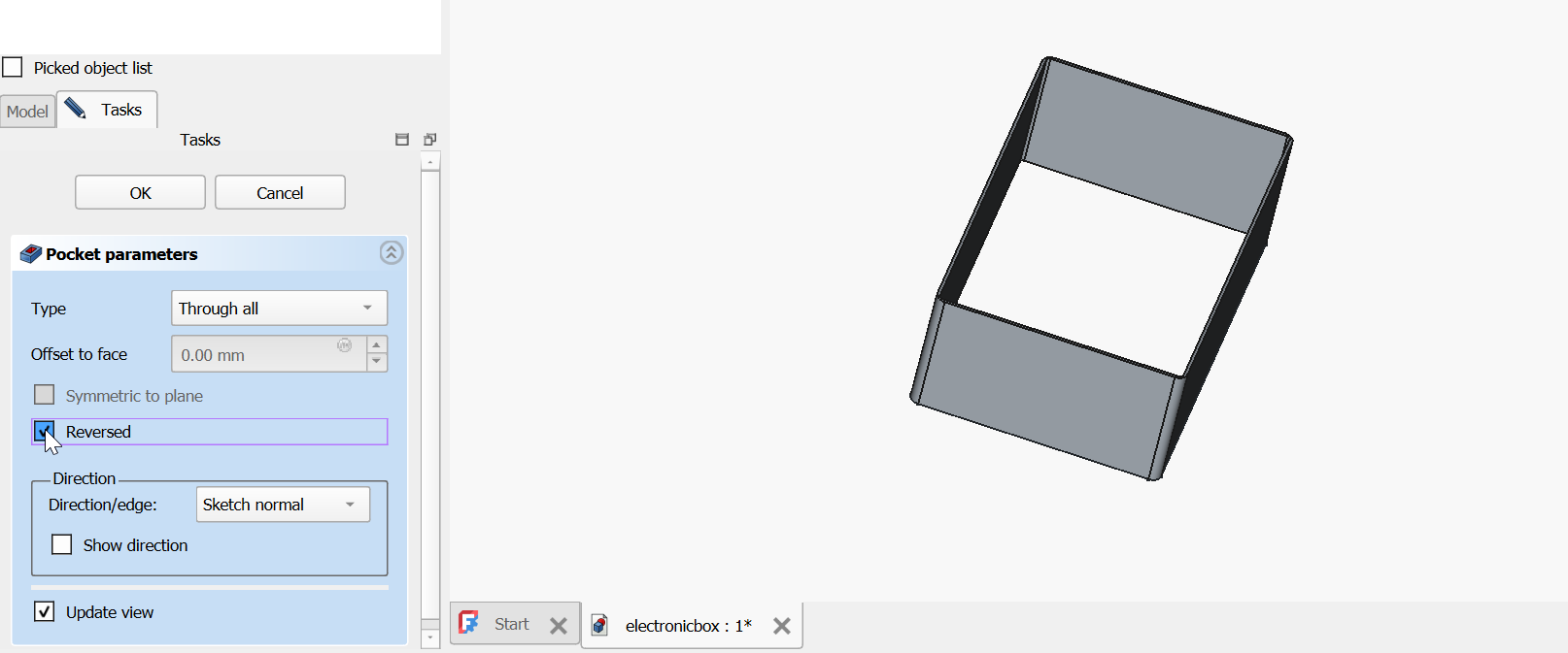 This created a hollow box with walls defined by the Thickness parameter. The final model is a parametric electronics enclosure.