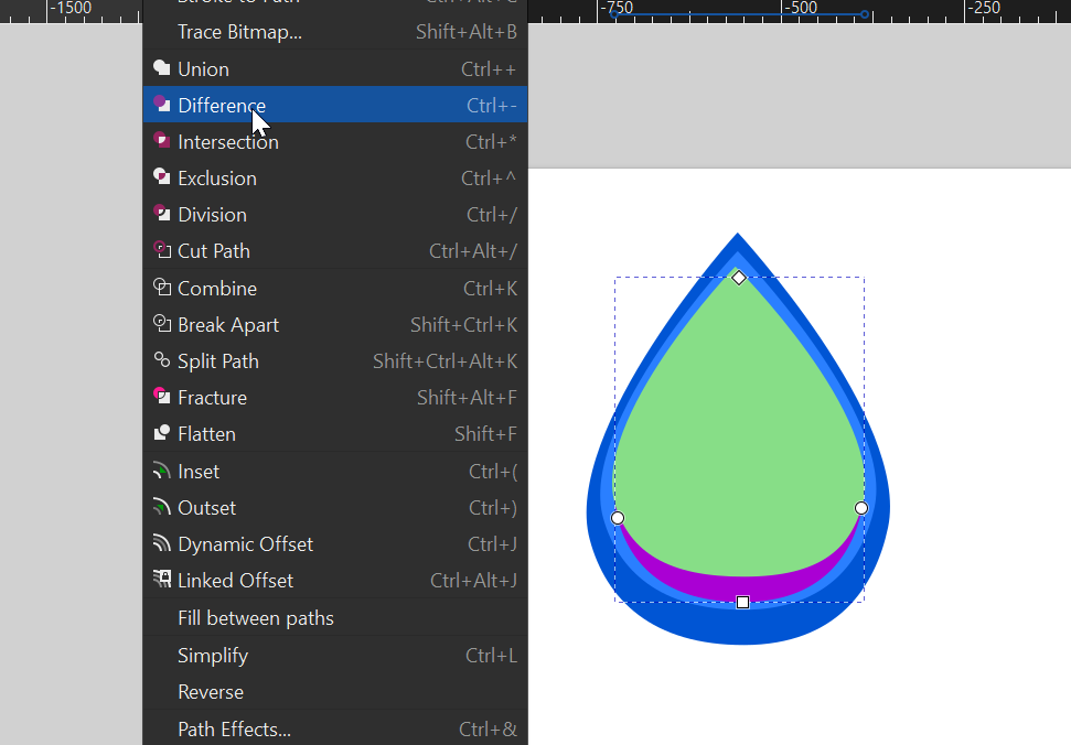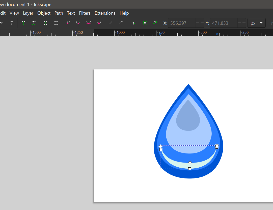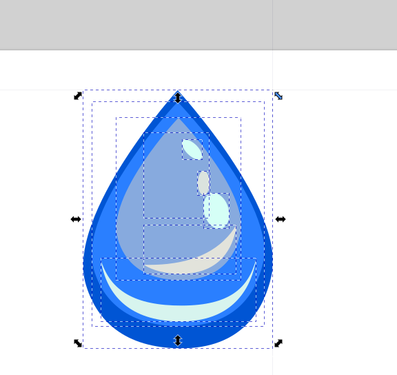 To create the white highlight inside the drop, I duplicated the same shape multiple times. To get the inner white curved space, I used Path → Difference to subtract one shape from another, leaving the white space.