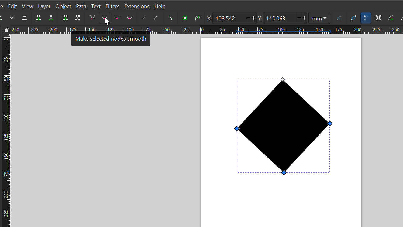 I started by drawing a square, then rotating it so that two corners were vertical and two horizontal, forming a diamond shape. I did this while holding Ctrl to control the rotation under the node tools.