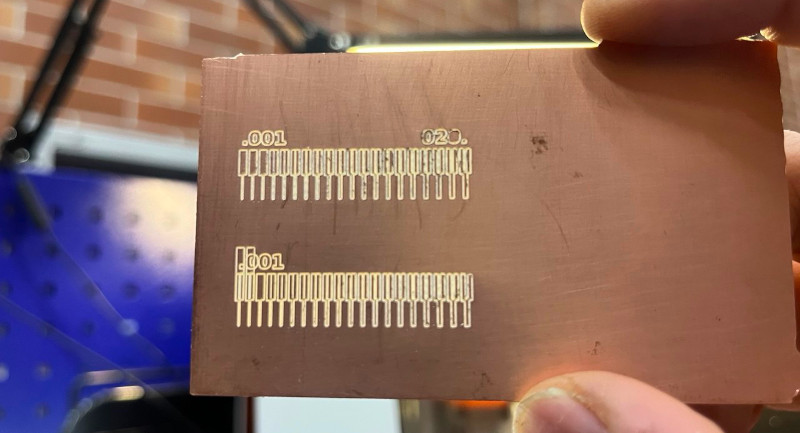For the trace width testing we used the MIT Mods program to generate the toolpath. We started by opening up a new “Mill 2D PCB” instance under the Roland SRM-20 menu in the software. Then we imported the PNG in the “Read PNG” block. The software loade the data which was transmuted to the blocks downstream. Then leaving all of the default settings, we clicked the calculate button on the “mill raster 2D” block. This calculated the toolpath.