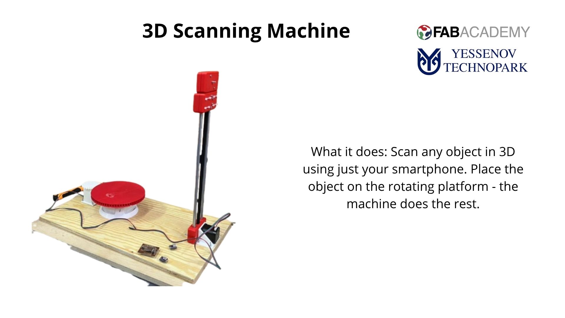 The final machine successfully scans objects using a smartphone and a motorized rotating platform. The project was completed as part of the Fab Academy Machine Design week at Yessenov University Fab Lab.