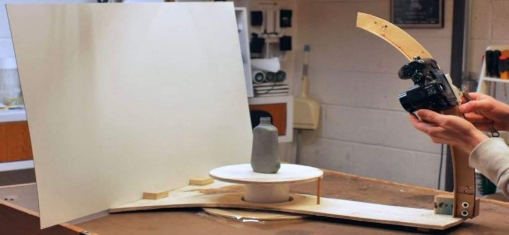 The scanner operates using a rotating platform system. The object is placed on a turntable, and a motor rotates it step-by-step while a camera captures images from multiple angles. These images are then processed in photogrammetry software, which reconstructs a 3D model based on overlapping features.