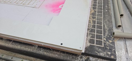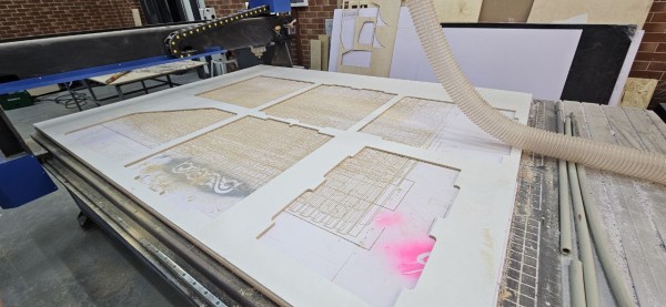 I moved the spindle to the corner of the sheet to set the Work Home (X and Y zero points). This ensures the design is perfectly positioned on the physical board and won't cut outside the material.