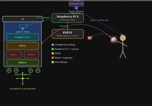 Technical Summary for your Documentation: "The SmartBin utilizes a decoupled wireless architecture. A Raspberry Pi 5 serves as the vision processing unit, calculating projectile trajectories from camera data. These coordinates are transmitted via WiFi to an ESP32 microcontroller, which drives a 4-wheel holonomic (Omni) base for instantaneous mid-air interception."