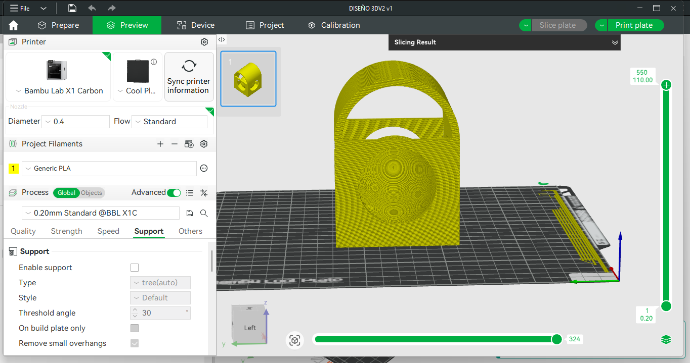 The slicing process was carried out using Bambu Studio, the proprietary slicer of Bambulab printers. The following printing parameters were applied: