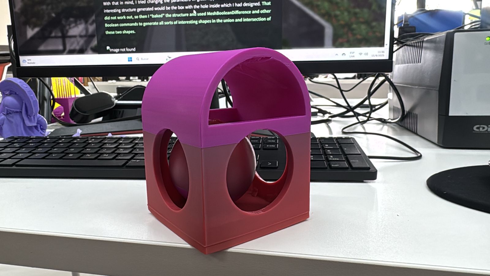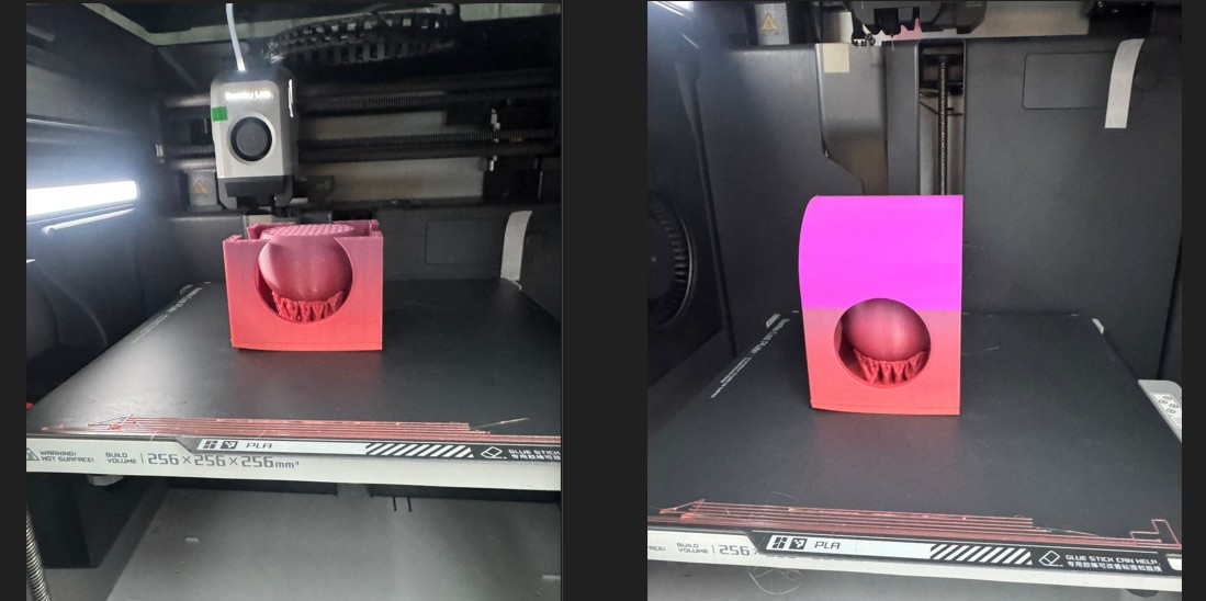 The object was designed in Autodesk Fusion 360 as a nested geometry where one internal component is mechanically trapped inside an external shell. This configuration cannot be produced through subtractive manufacturing methods such as CNC milling because the internal geometry would require tool access that is physically impossible once the outer shell is closed. The model was sliced using Bambu Studio with a 0.15 mm layer height, 15% grid infill, 1 mm wall thickness, and no supports. The object was printed in a single piece using PLA filament and a 0.4 mm nozzle diameter.