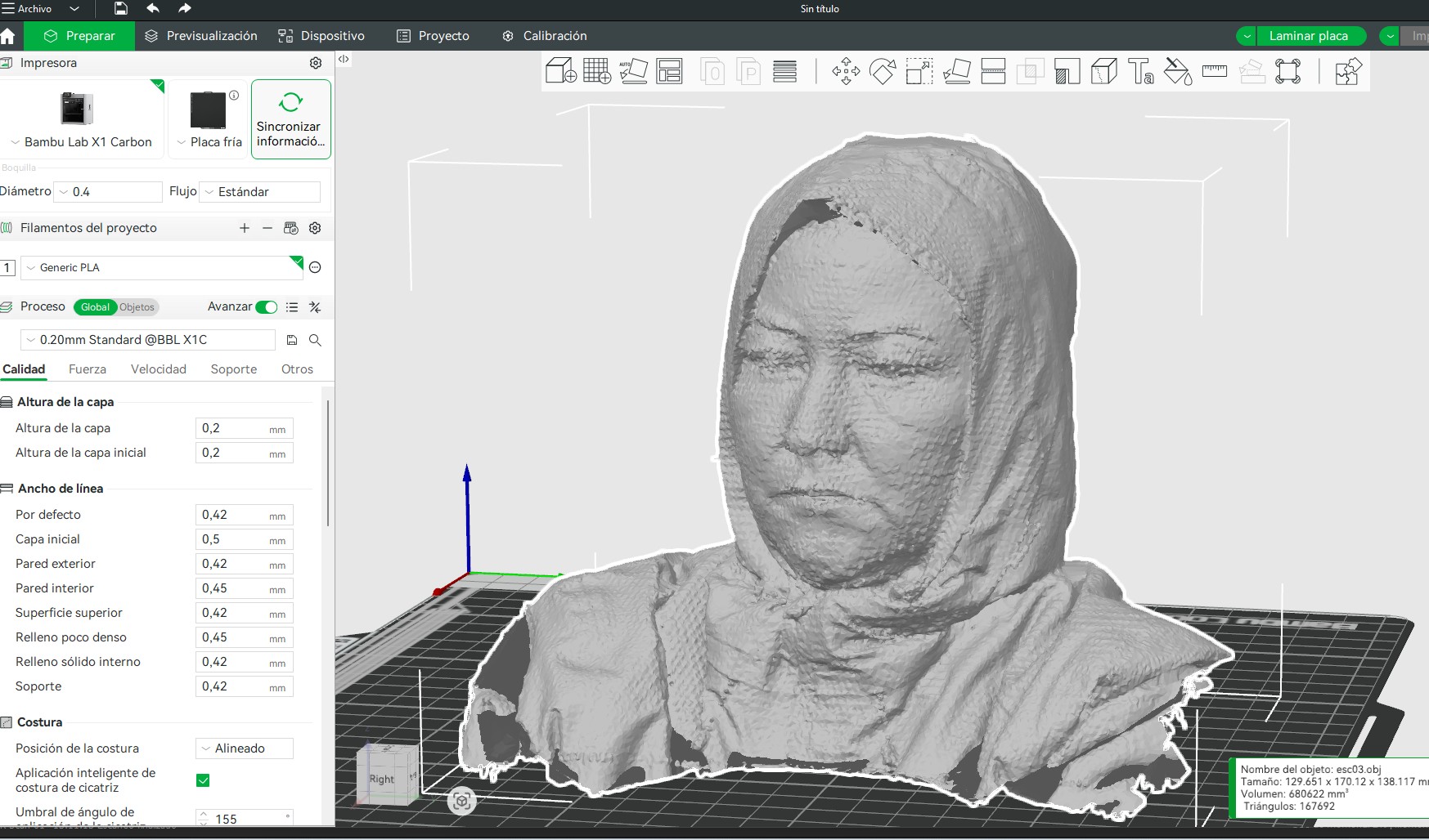 The cleaned 3D model was exported and prepared again in Bambu Studio using the Bambulab X1 Carbon printer. No supports were required due to the design orientation. A smooth surface finish was achieved using the slicer’s “smooth” tool path optimization, resulting in a detailed and faithful reproduction of the scanned geometry.